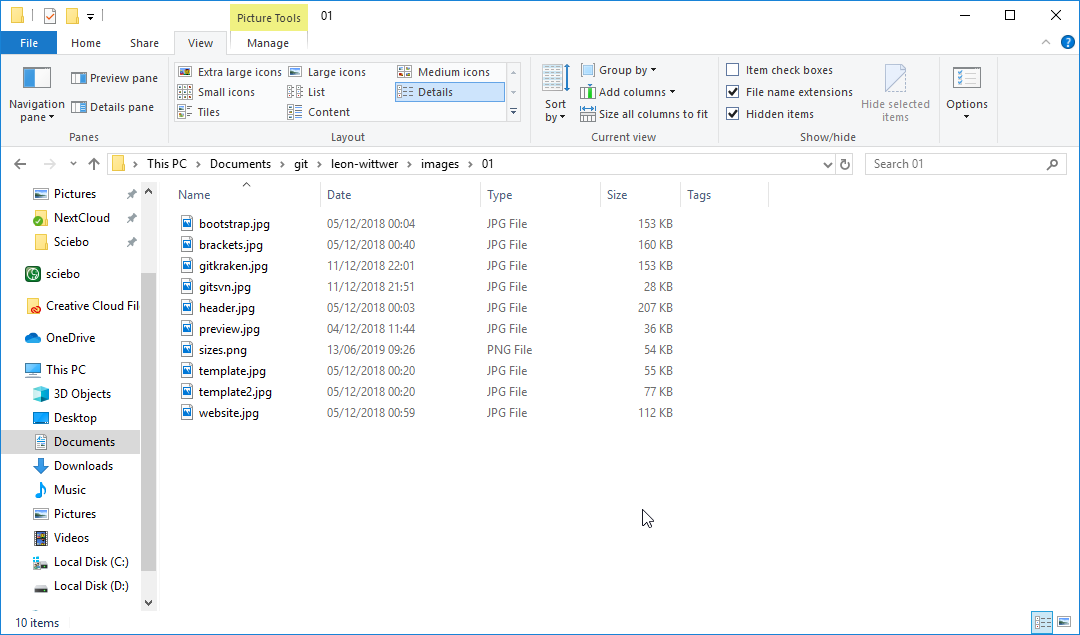 To get the size of this webpage as small as possible, I compress every image before uploading it to git. I start by writing the website and adding images and in the last step before uploading, I look at which images need to be compressed. I am just opening the windows explorer to look into the folder with all the files for the website and switch to the details pane to see how big all the files are. I try to get the file size to 100-200kb for every picture that spans the whole page, 200-300kb for the header image and everything that is a smaller image even smaller.