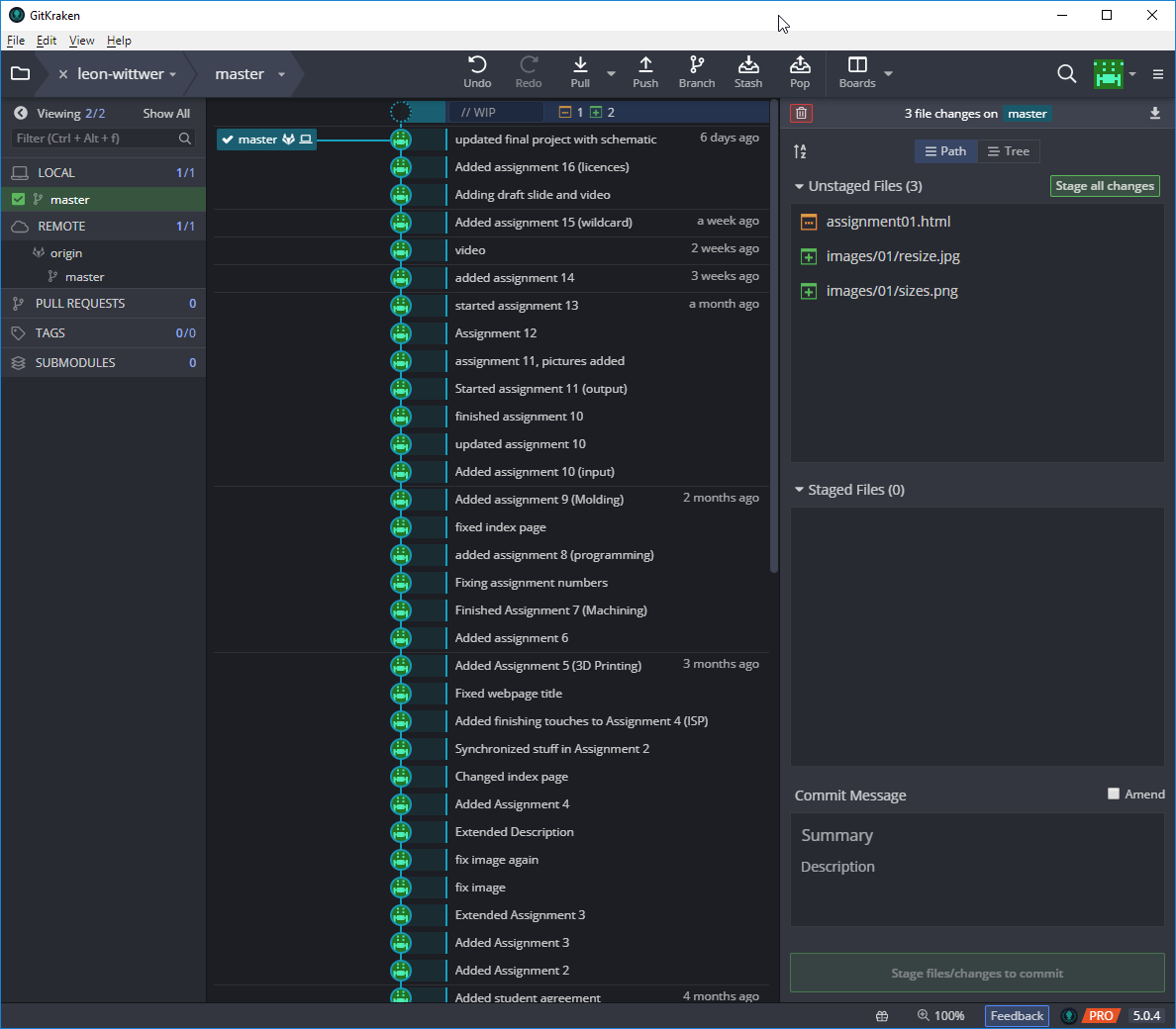 To upload a file in the GitKraken client, you first need to add a new file or change something in a file in the repository. Gitkraken then shows you your changes on the right side under Unstaged Files. You can see that I changed one file (orange icon) and added two files (green icon). To upload all files and changes you can click Stage all changes. Then the files move to the lower part, to Staged Files. This means that they will be added to your next commit. Commit is a "change message". Then you need to say what this commit is about down in the Summary of the Commit Message. Then you can click on the Commit changes to 3 files button at the bottom. Now you have saved your changes locally and to upload them you need to click Push button on the top.