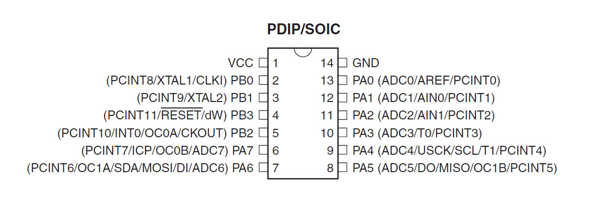 The first thing I learned which helped me was the pinout with all the different pins of the attiny44 and the corresponding functions and names behind it. I used this while designing the board and also while programming to look up the pins I connected something too.