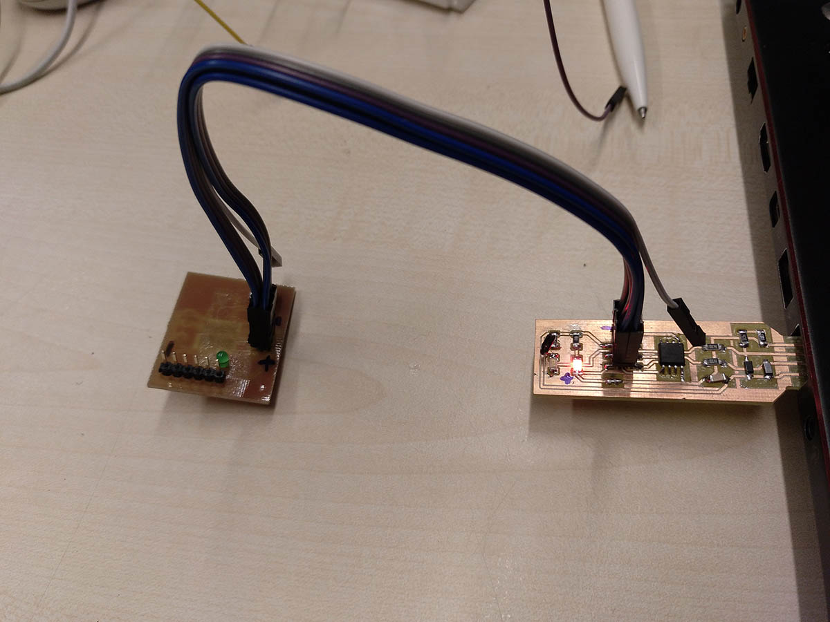 }Then you need to connect the hello world board with the usbtinyisp programmer and the programmer to the computer. To program the hello world board with this program you only need to run make program.