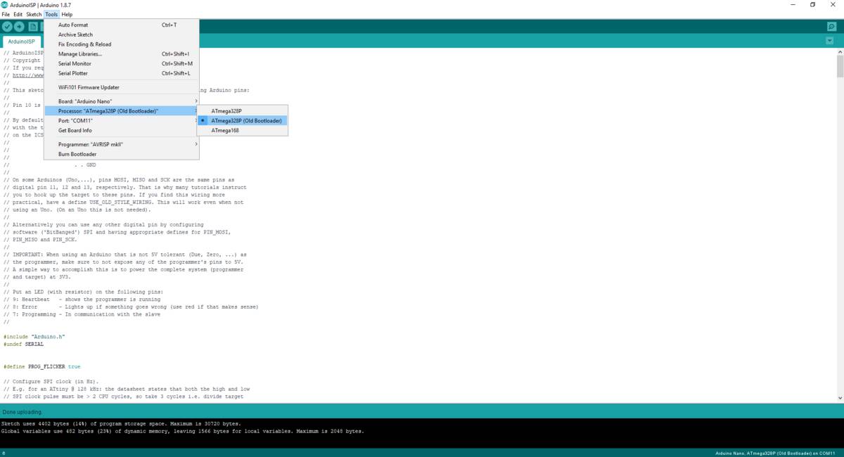 But how do you get it onto the attiny? For this I followed this tutorial. I only had an Arduino Nano lying around and wanted to use a different attiny, but the tutorial still holds. First you connect the Arduino with your computer and configure it as an ISP: Open the ArduinoISP Example (File -> Examples -> ArduinoISP), choose the correct Board, Processor and Port under Tools.