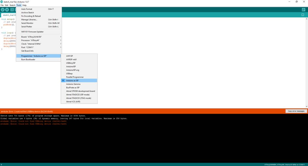 In the ArduinoIDE you should (again under Tools), change the Board, Processor, Clock and Port to match the attiny. Then set the Programmer to Arduino as ISP.