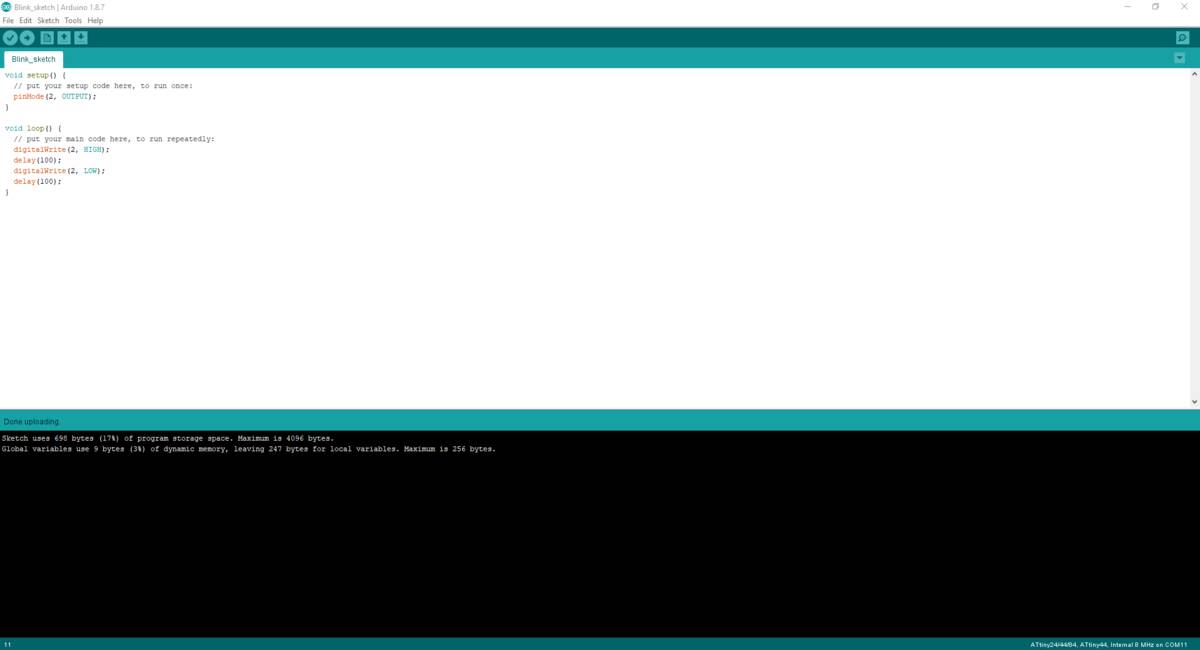 As programming in plain c can be quite annoying for bigger programs or also for just trying something I decided to also get to know how to program the attiny44 with the Arduino IDE. This is a kind of c code but a lot of functionality is predefined. Which makes the program look much cleaner and is easier to understand. But see for yourself. This is the same blinking program as above: