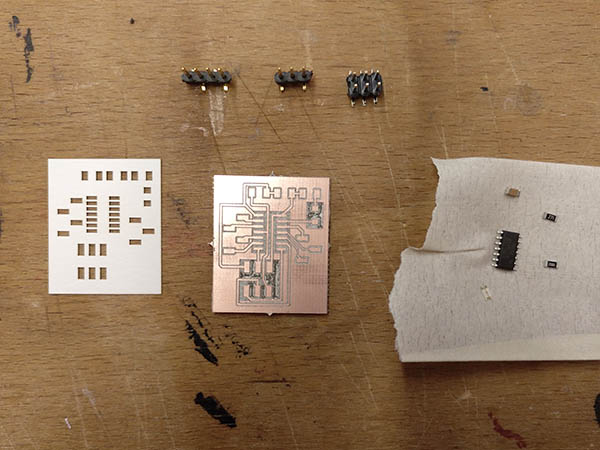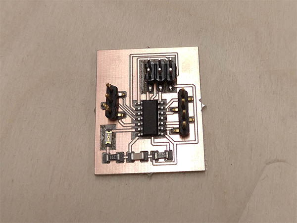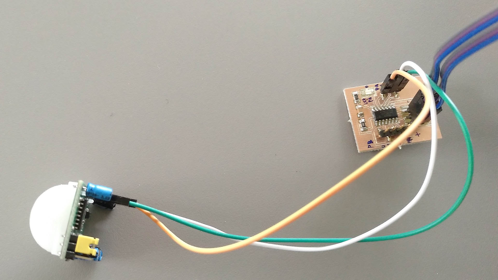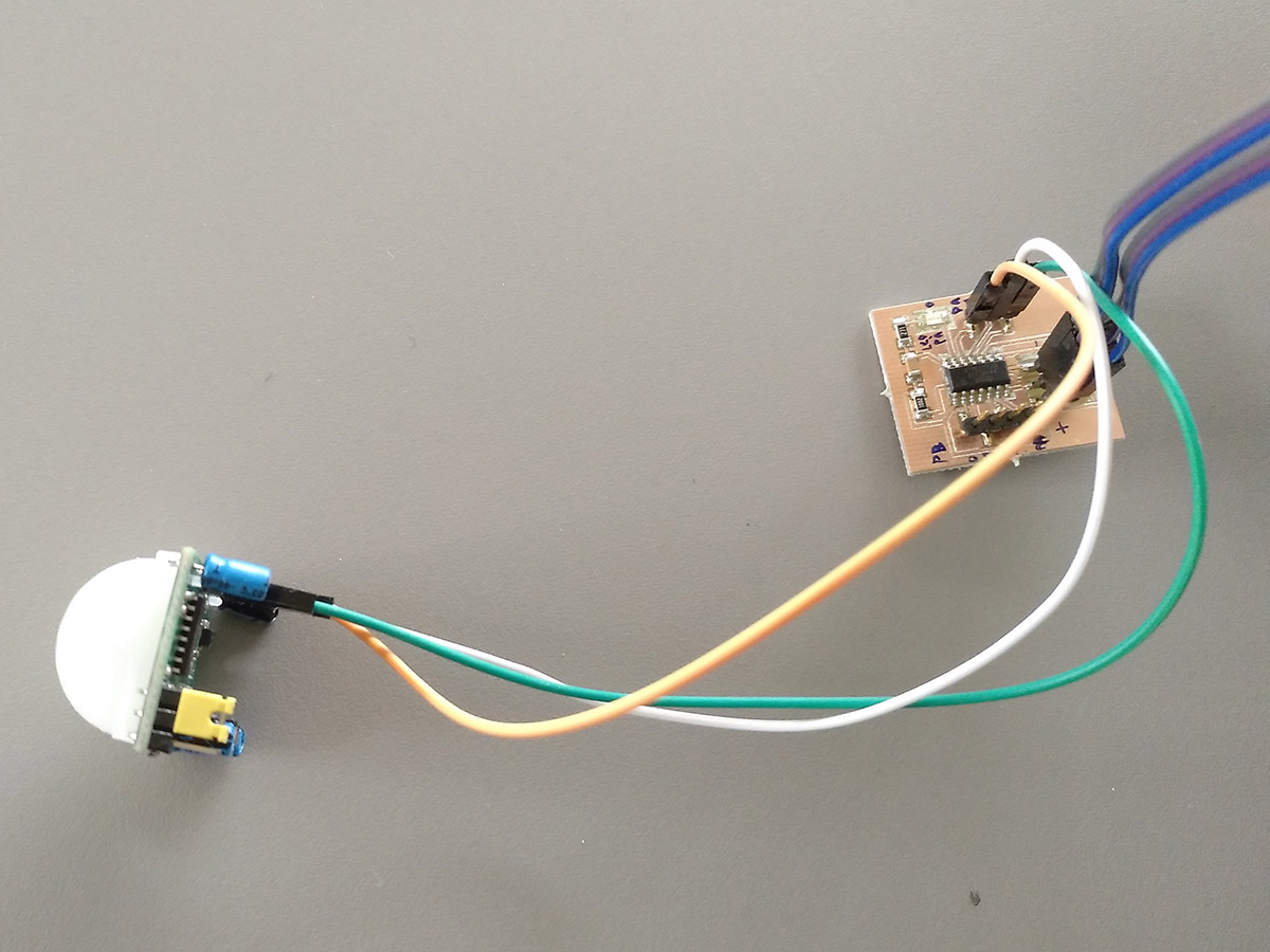 Before I hooked up the PIR to the attiny, I wanted to make sure that it is safe and I don't destroy the attiny when drawing too much current. According to the seller, the PIR has a rest current of 65 uA. The attiny44 datasheet lists under electrical characteristics that the maximum current per I/O pin is 40mA, so it should be safe to use the attiny for powering the PIR sensor. I programmed the attiny using plain c and the USBTinyISP. Details on the programming environment can be found in the embedded programming week. The finished program can be downloaded at the bottom of the page.
