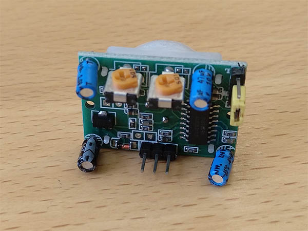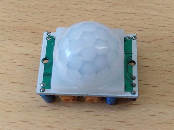 I decided to go with a passive infrared sensor (PIR), which can detect motion by detecting changes in the infrared emission which hits the sensor. I chose the SR-501 PIR sensor, which is already a breakout board for the raw sensor, with a lens which makes the detection just possible and a small circuit to filter the raw sensor output to make it easier to work with the sensor. So the finished sensor board just needs power (5V-20V), a ground connection and has an output pin which yields a high value when motion is detected. Later I realized that the circuitry also brings some problems, which I will explain later.
