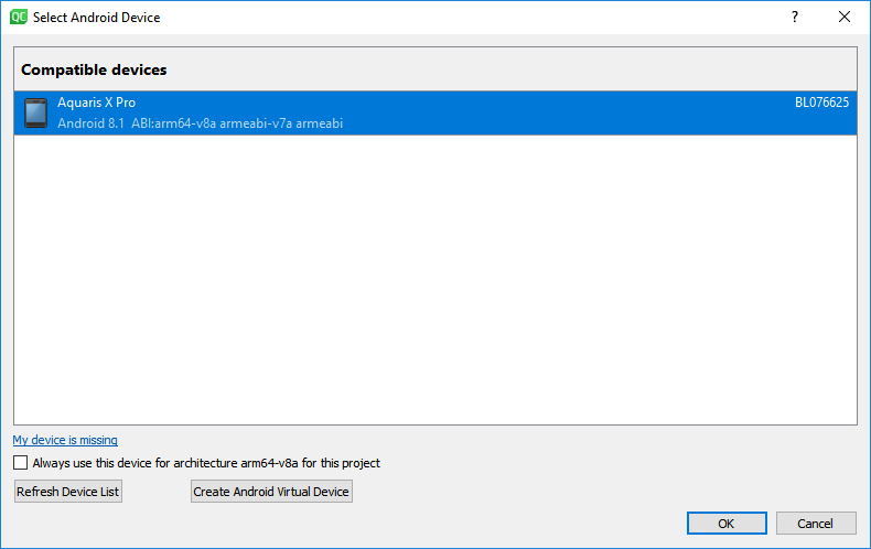 As the big advantage of qt is the ability to deploy software to multiple platforms I wanted to compile the program to run as an app on my smartphone. After installing everything I soon realized that it wouldn't be so easy. First it took some time to figure out which paths qt wanted to know and how to install the platform tools and usb driver. You can install the platform tools in android studio and the sdk path qt wants to know is C:\Users\"User"\AppData\Local\Android\Sdk under windows in standard settings. Another point that is good to know is that the ndk can be installed from within the android studio, but for me this caused problems as stated here. Ndk version 20 is not compatible, so I installed 19c instead. Also when installing the jdk make sure that you install version 8, otherwise something else won't work. At some point I also needed to restart the qt creator to get rid of cryptic errors. The furthest I got without errors was that I could already choose the device on which my app should be installed to test.