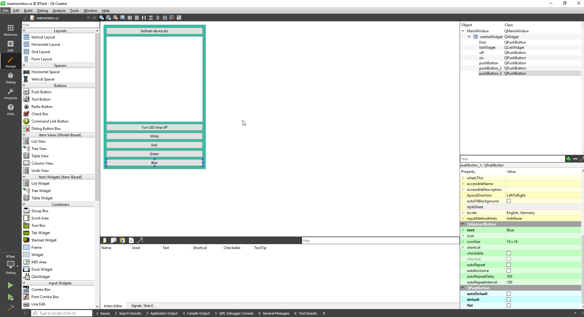 A nice feature it has is a designer, where you can design the ui interactively, which is much better than doing that in program code. But as I tried to adjust this app I found out that with C++ ui the designer is very limited. Years back when I worked with QML in it I remember that the designer worked well, but now in C++ I was not even able to change the button color to what I wanted, without defining completely new classes. So everything is now greenish and this are just the basic style PushButtons that are available in the qt framework.