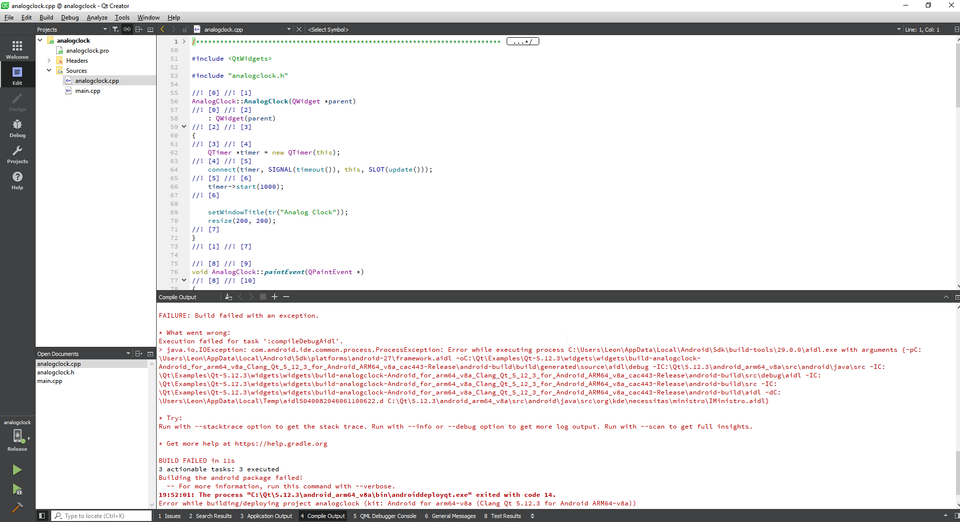 The error I finally gave up on was this one. It seemed that it was again something that had to do with incompatible software versions of the qt creator, android studio, the ndk and jdk. This was not the first problem because of incompatible versions and I decided that I didn't want to put in more hours to get it working.