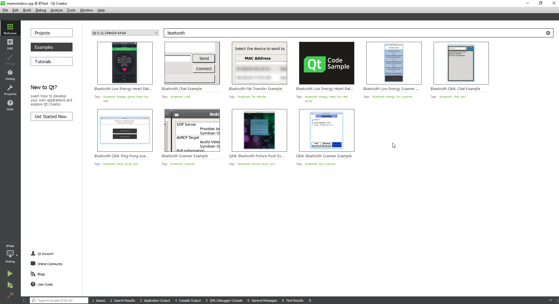 First comes, of course, installing the IDE, which is straightforward. Qt also has a lot of examples available, so I did first look at the bluetooth examples and tried to figure out if one of them is similar to what I want to get. Basically I want to search for bluetooth devices, connect to one and send serial data to it. But none of the examples would send data over this (RFcomm) connection, so I searched some more and found this example online, where somebody else interfaced the hc-05 with qt.