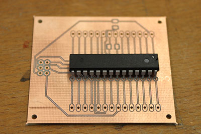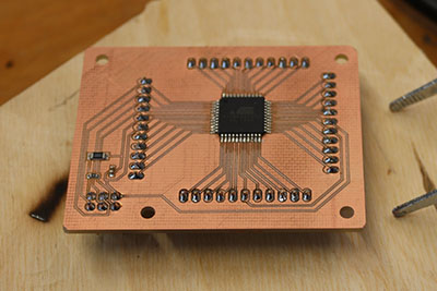 After trying to solder an XMega32A4 but connecting the majority of the pins and not being able to fix this I decided to go with another chip. So I produced the board with an ATMega328, which we had in the lab so it unfortunately is no SMD chip, but easier to solder.