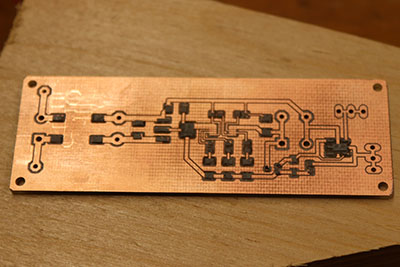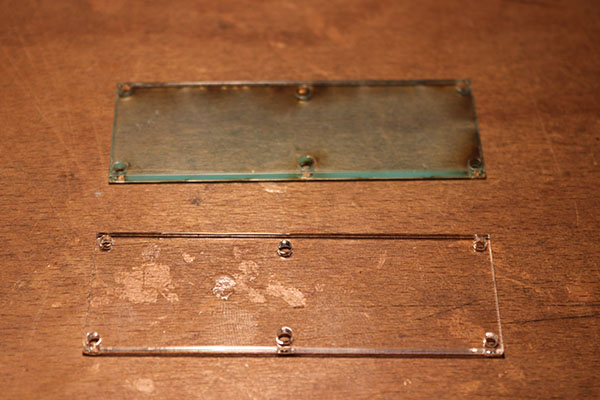 As we can only produce PCB boards with open connections it is important to protect them from being shortened, especially when other conducting stuff is around. So I decided to cut a frame from plexiglass to fix the boards together with screws.