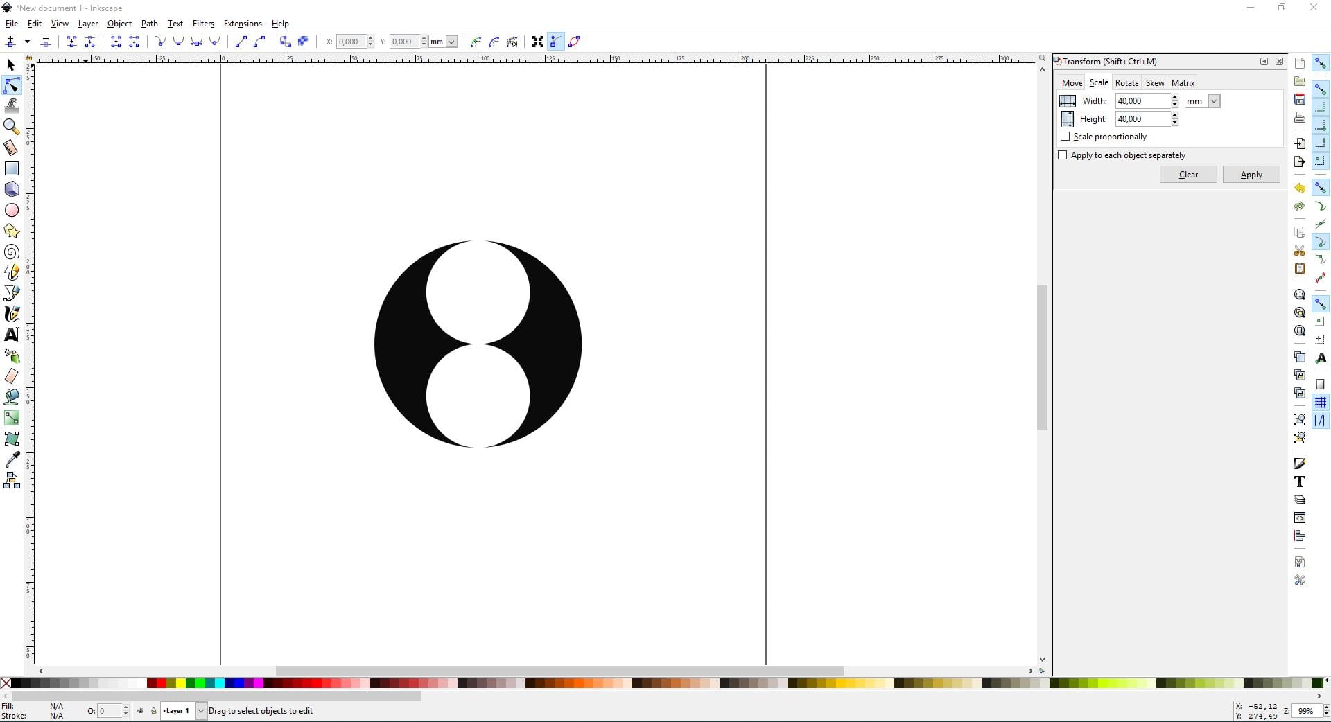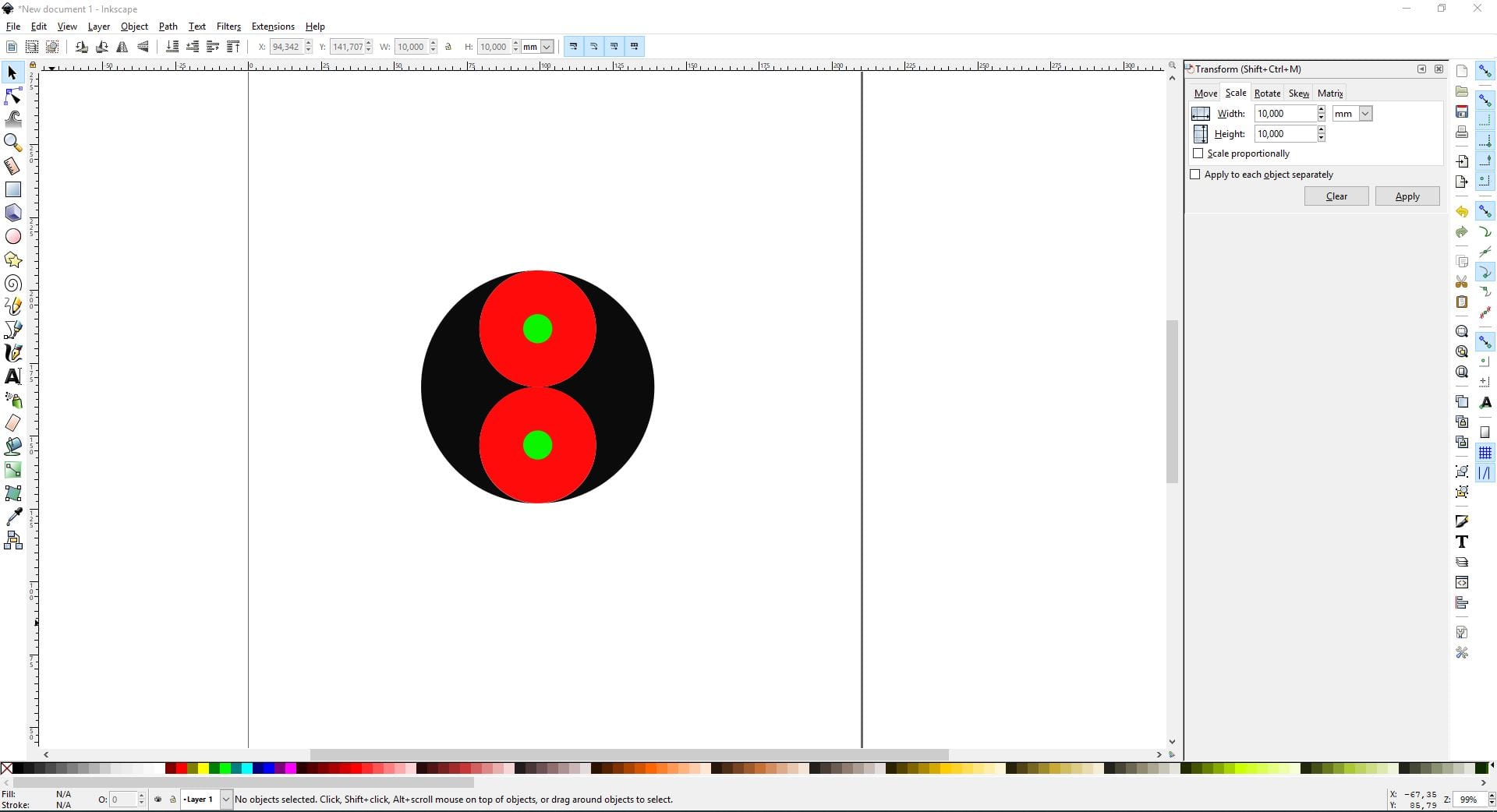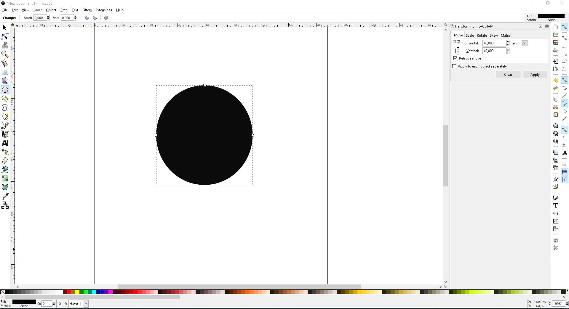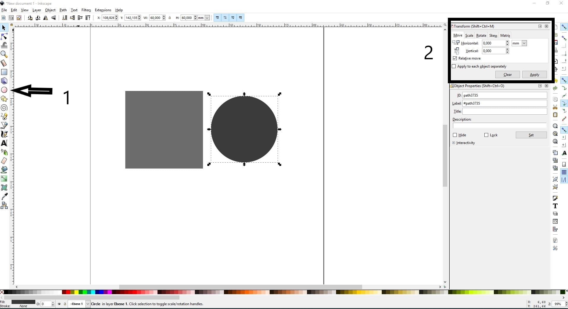 To draw a circle click und the circle tool(1) and draw it like the rectangle. To change its size the Transform-menu (2) is used. To bring it up press Shift+Ctrl+M. After entering the numbers hit Apply.