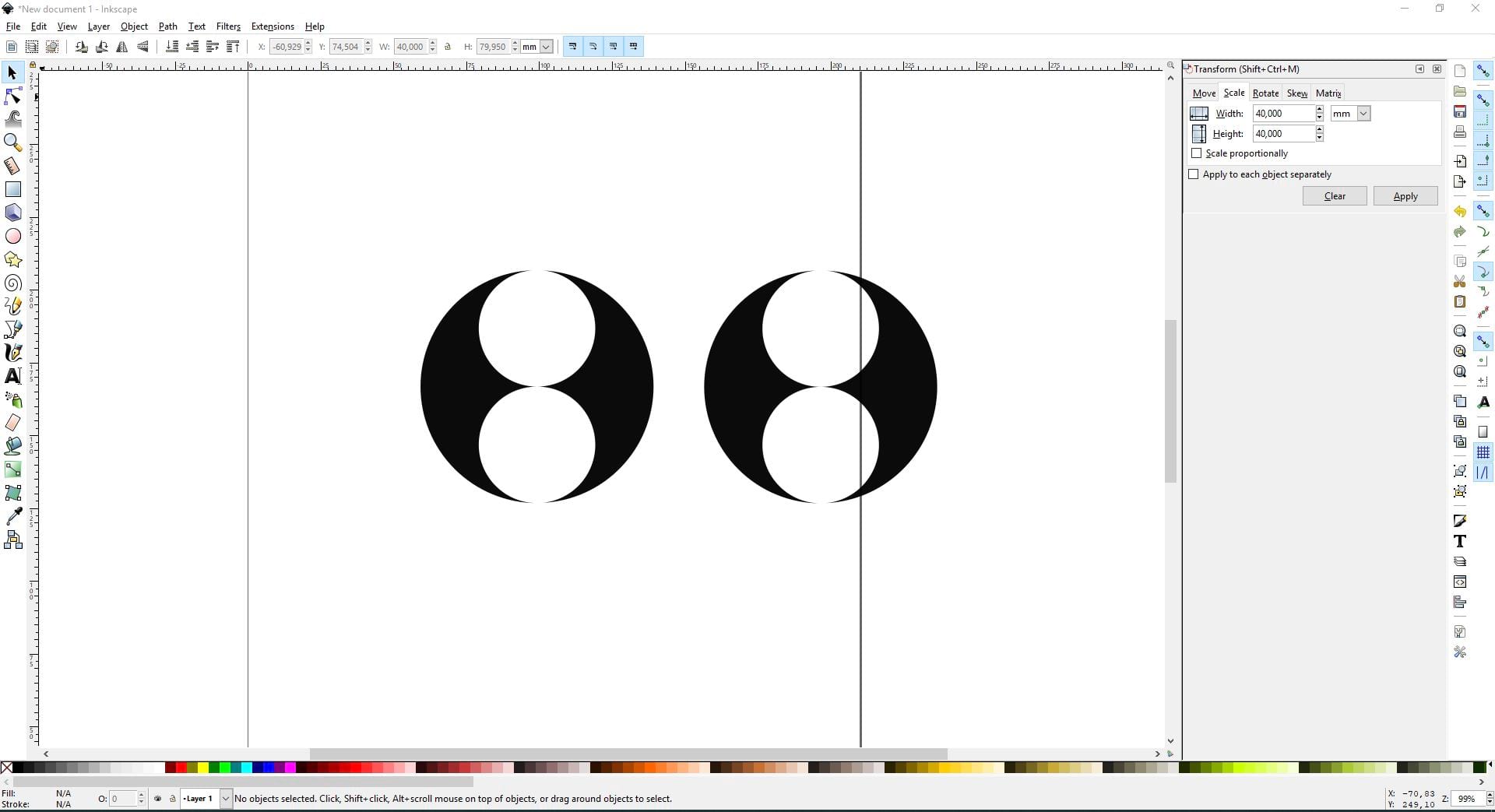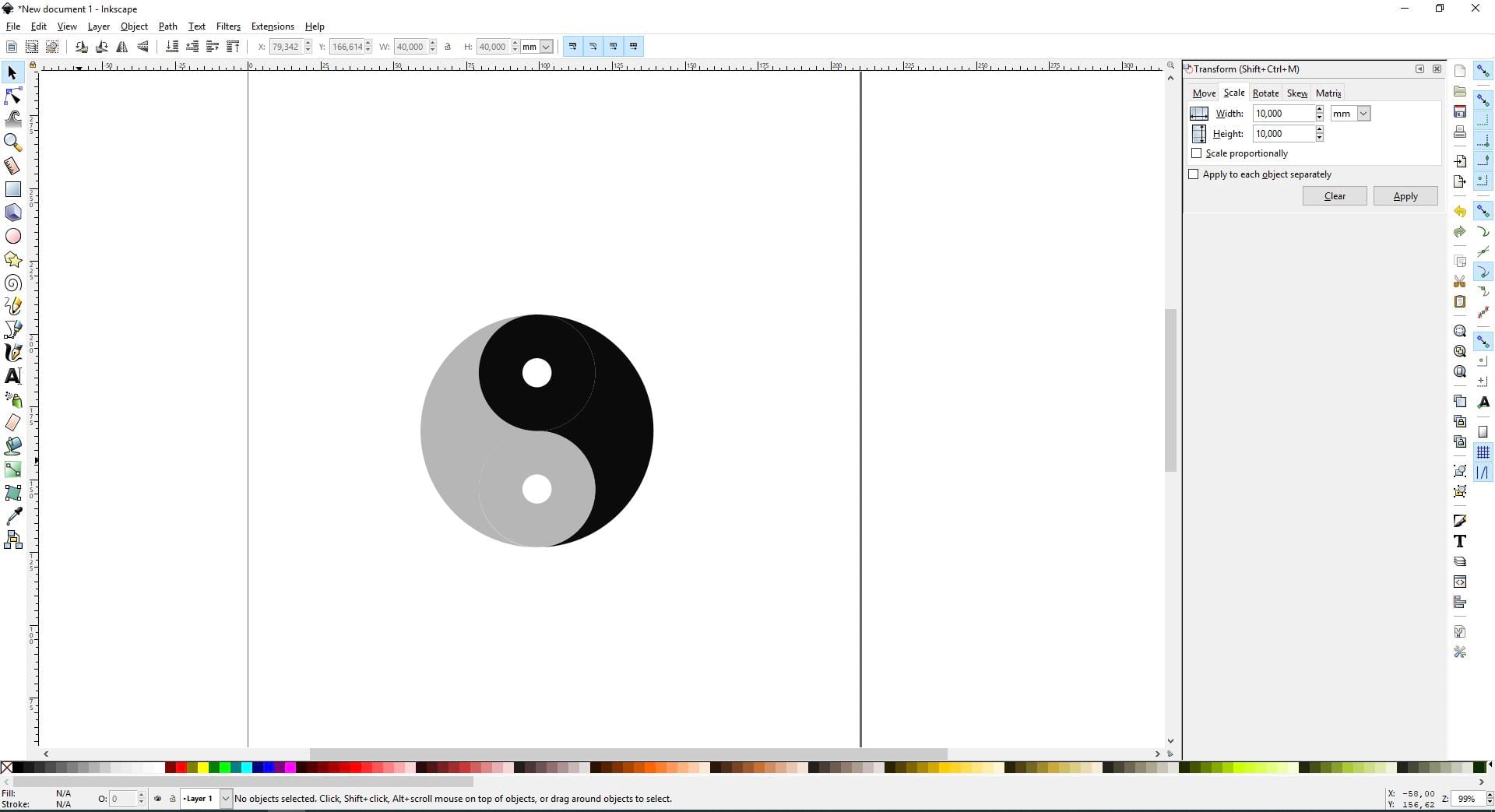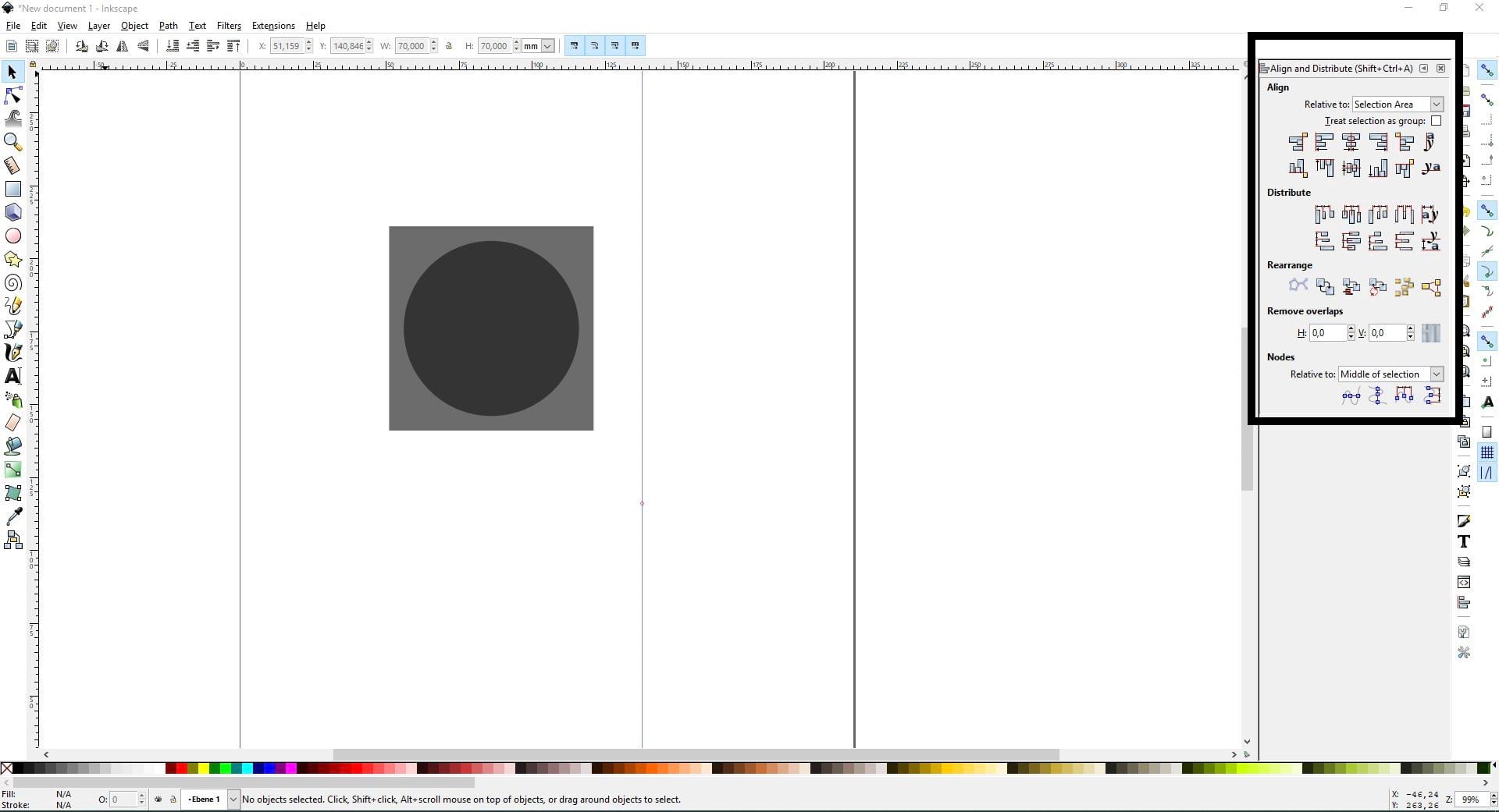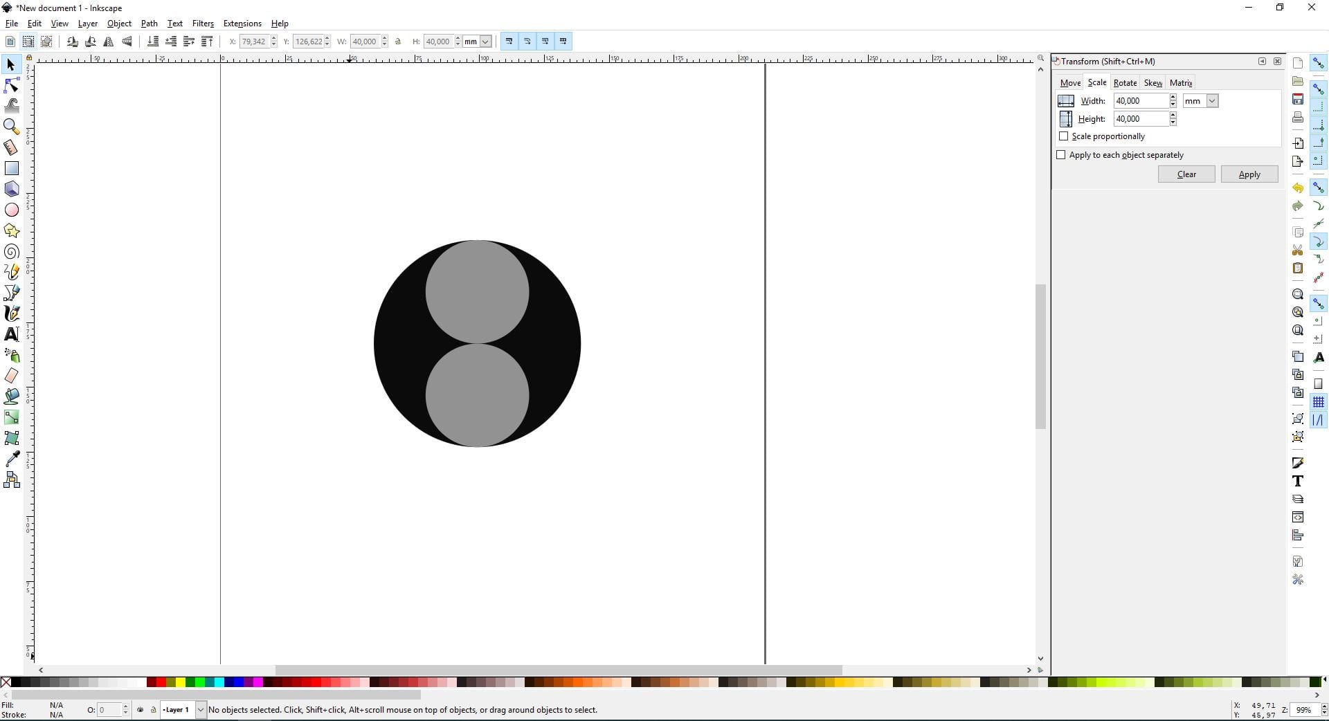 To draw a circle click und the circle tool(1) and draw it like the rectangle. To change its size the Transform-menu (2) is used. To bring it up press Shift+Ctrl+M. After entering the numbers hit Apply.