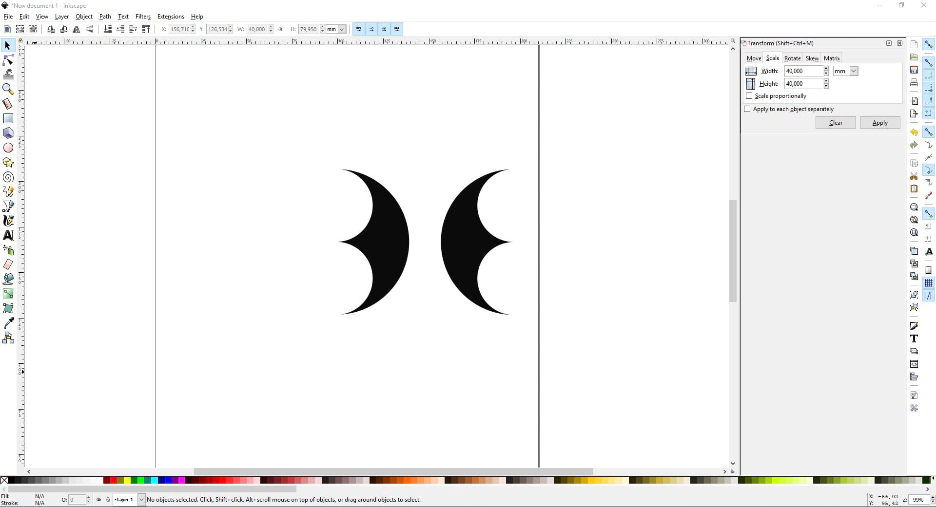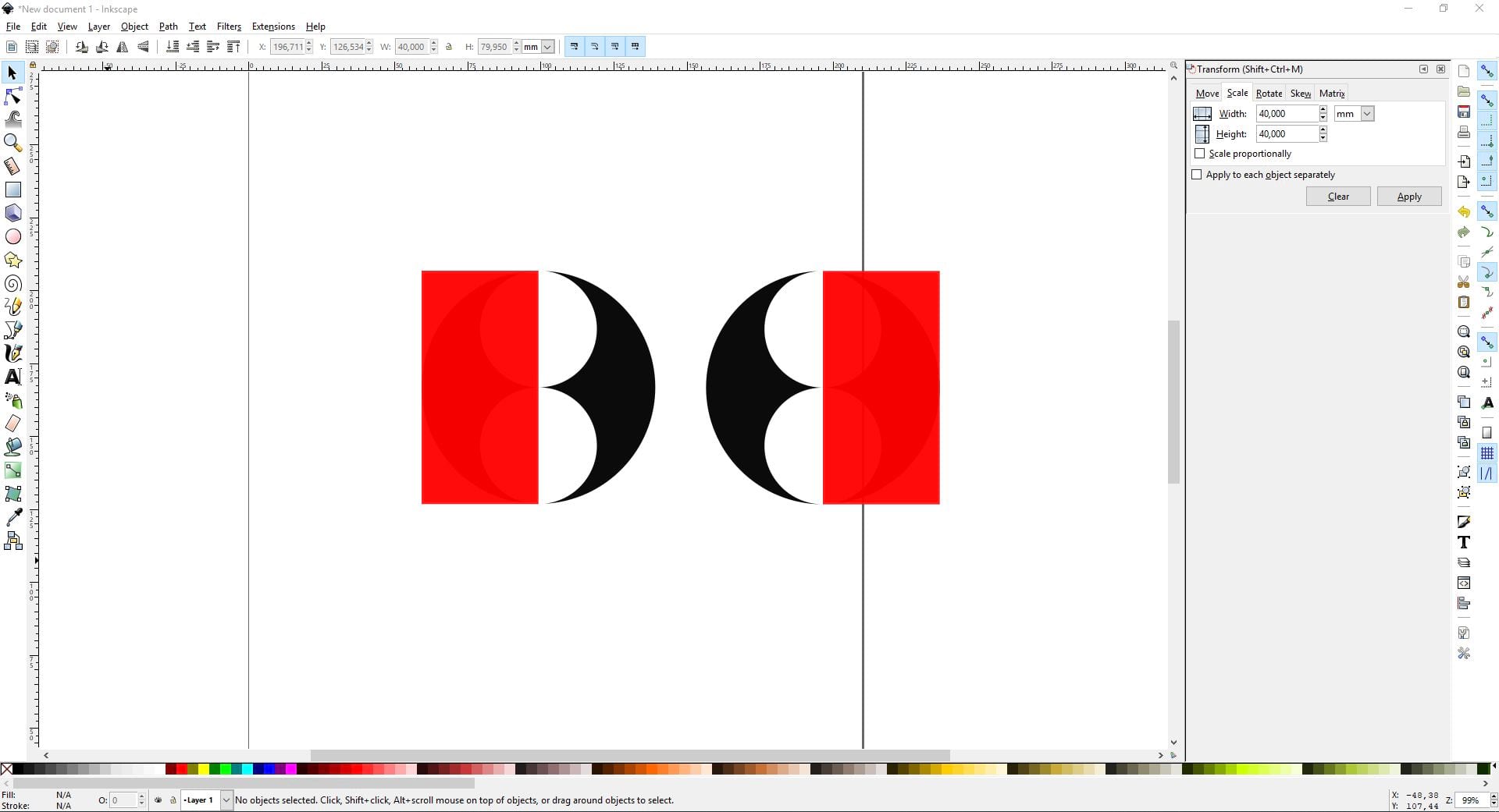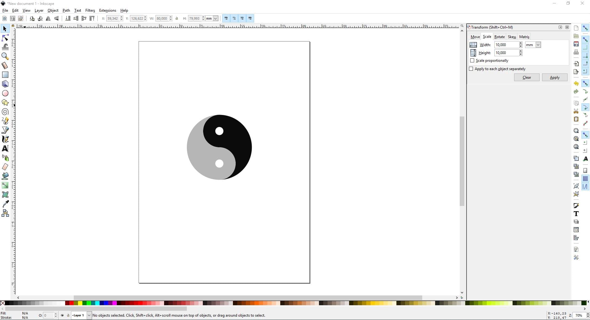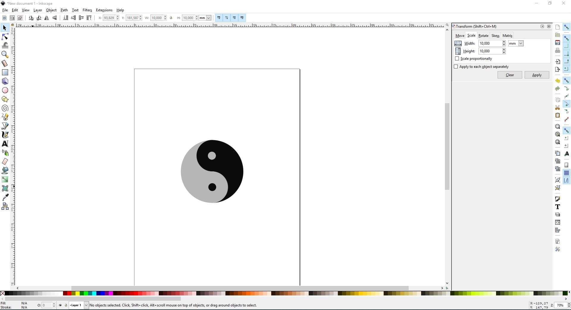 To draw a circle click und the circle tool(1) and draw it like the rectangle. To change its size the Transform-menu (2) is used. To bring it up press Shift+Ctrl+M. After entering the numbers hit Apply.