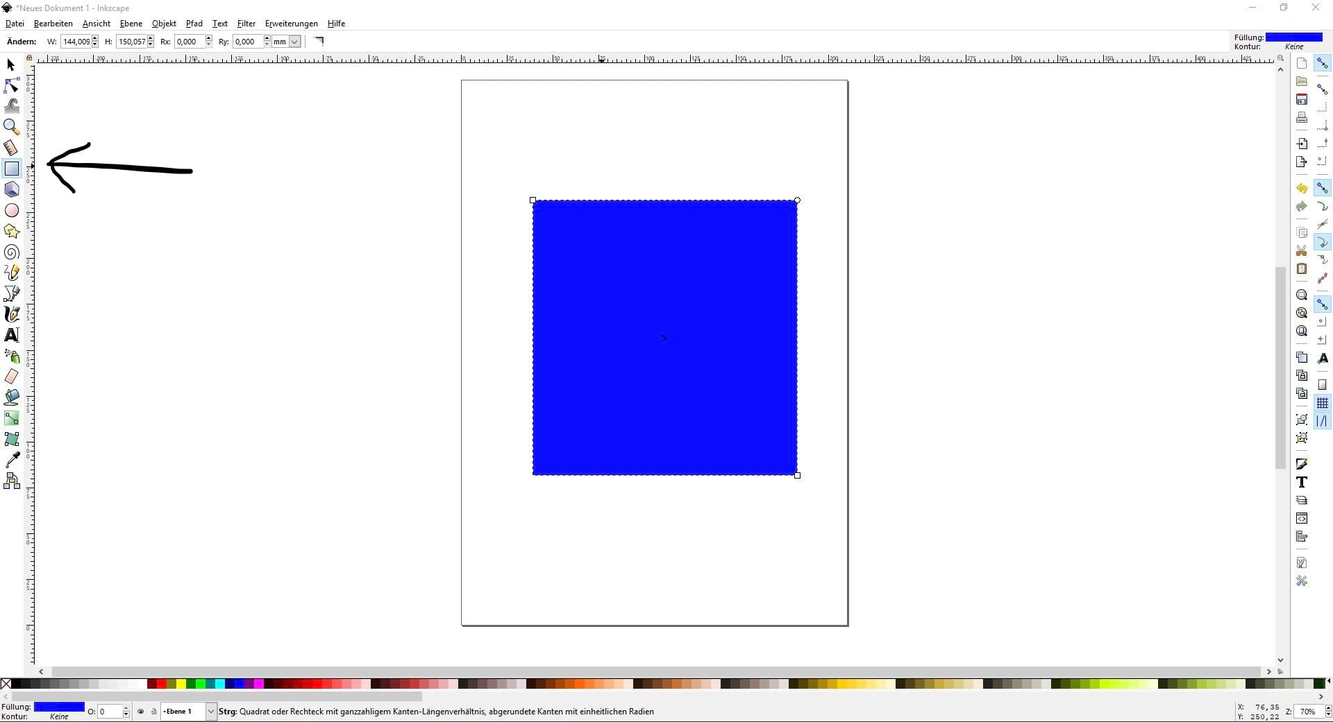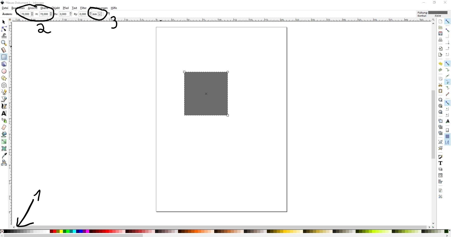To change the color select the rectangle and click on the desired color at the bottom (2). At the top (2) the size of the rectangle can be set precisely by altering the numbers to the desired height and width in mm. The unit can be changed by clicking on the little arrow next to the unit box (3).