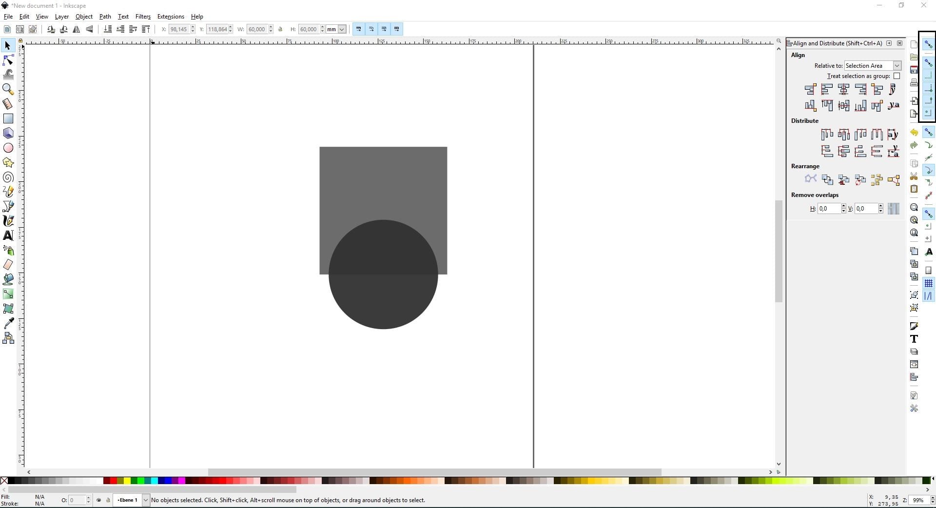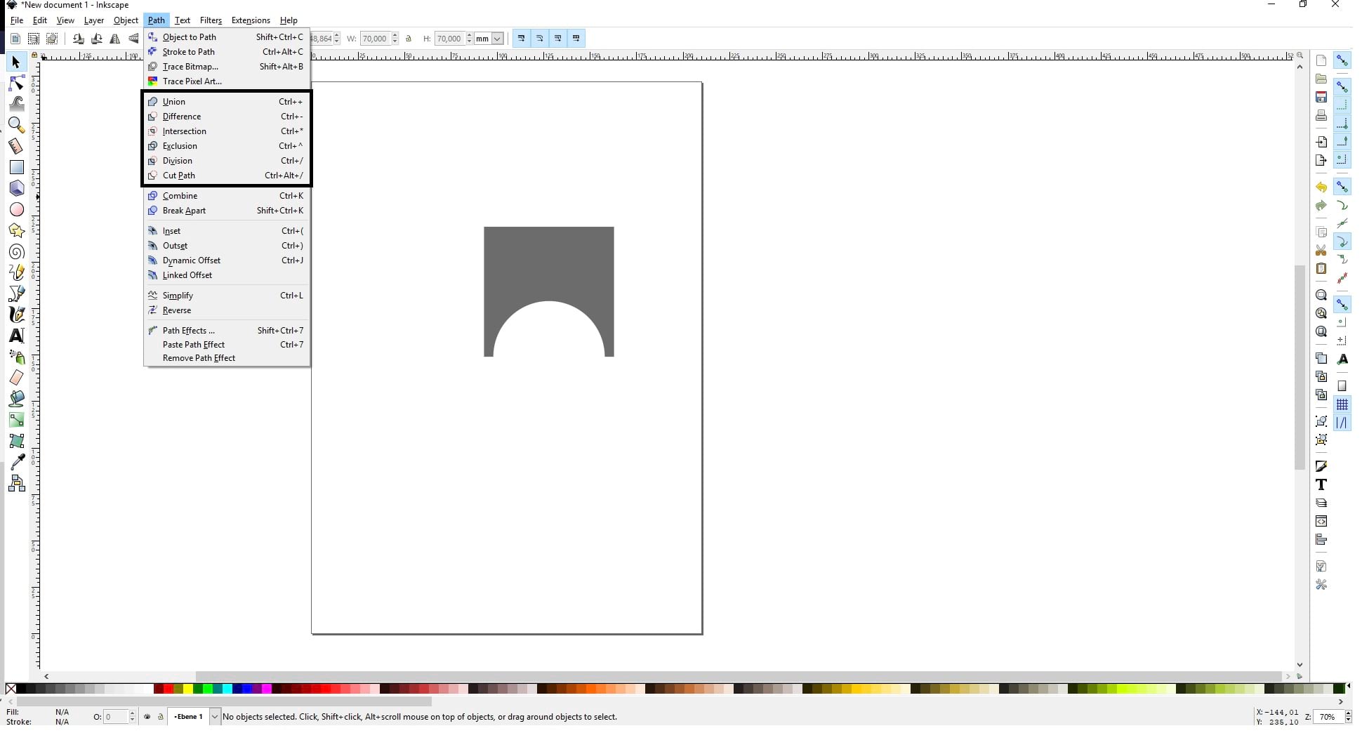 You also can calculate the difference and the union of object. To do so select the object and open the path-menu at the top. Now select the operation you want to perform. Here the difference of the circle and the rectangle from the previous picture was calculated.
