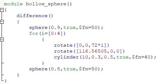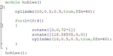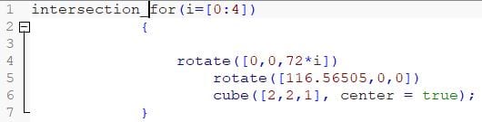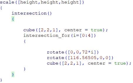 So to get this diamond 5 cubes are intersected via a for-loop utilizing a variable i. Each cube has a rotation of 116.56505° ,this was specified by the Wikipedia article. Every cube hat the measurements of 2*2*1.(Usually Open-Scad uses mm as an Unit). In every iteration such a cube will be placed and rotated by 72*i° around the z-axis. Then all of these cubes are intersected. The tag center=true ensures that every cube is centered.