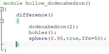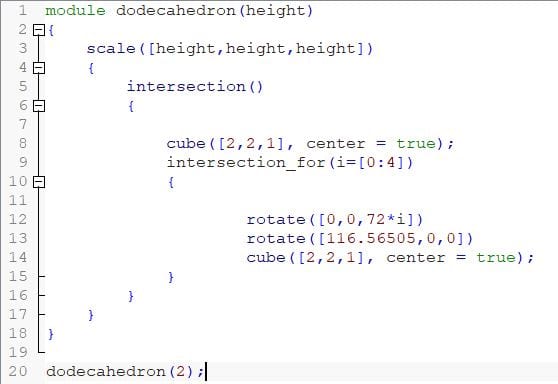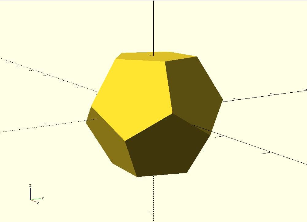 First I tried to design a dodecahedron by myself. I got the angles from Wikipedia. From a lecture I knew that you can build a dodecahedron by intersecting 6 cubes but could not get the last one right and was stuck with this diamond. Then I found out that the necessary Code already existed.