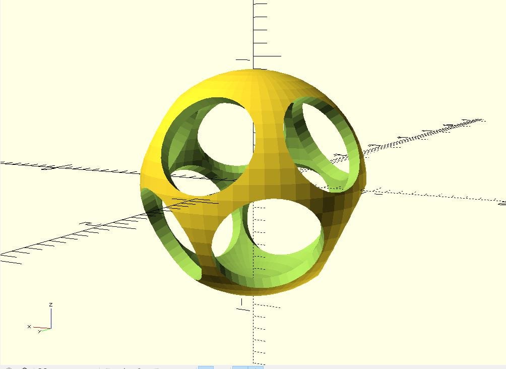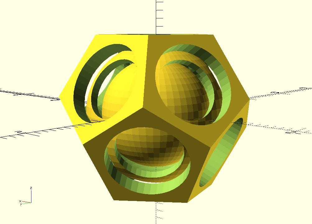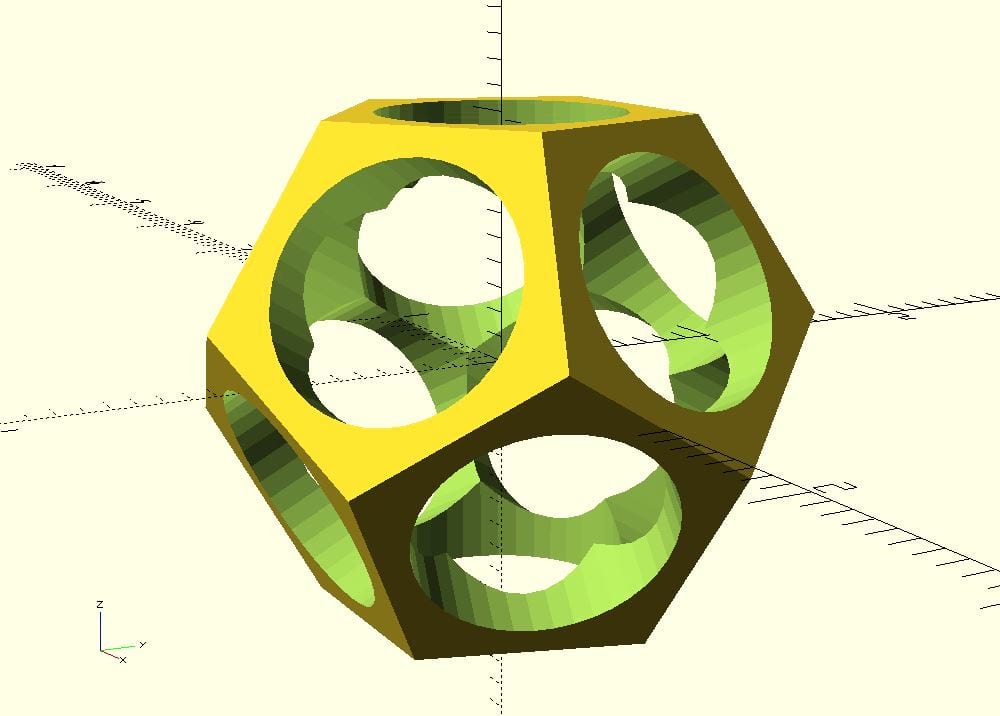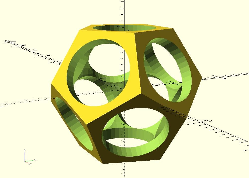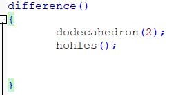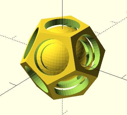 When we no calculate the difference of these two objects we get a hollow dodecahedron with holes in each of its faces.