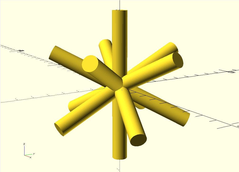 Now we want to punch the holes into the dodecahedron. To do so we need a cylinder for every face of the dodecahedron. We can modify the for loop that we used for the dodecahedron to get the orientation right. Here a cylinder with the length 10 an the radius 0.5 is used. The true is a short version of center = true and the $fn specifies how many segments the mantle of the cylinder will have. (choose high values for smooth surfaces)