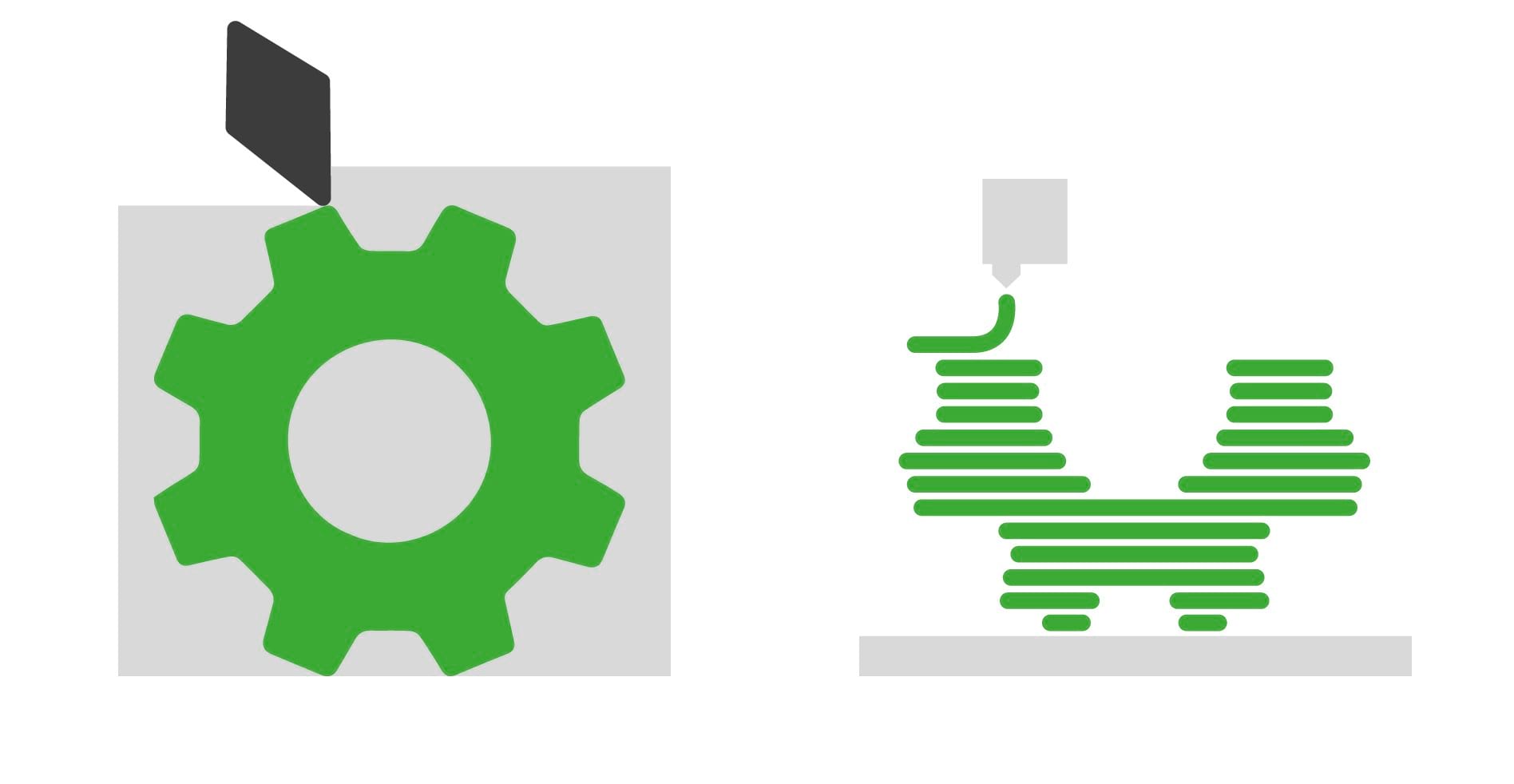 When using subtractive manufacturing methods you basically cut the shape of an object into the material. The amount of material that is available is usually fixed from the beginning. Examples for this method are for example milling and carving. Additive methods in contrast to subtractive methods do not start with a block of material. Here the whole Object is build from the scratch. 3D-Printing is a good example for this method. Here the Object is build layer by layer till ist finished. This results in a slightly rough surface. Both methods can be combined to achieve the best results.