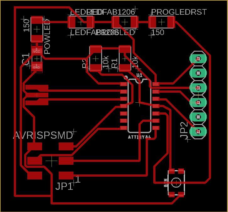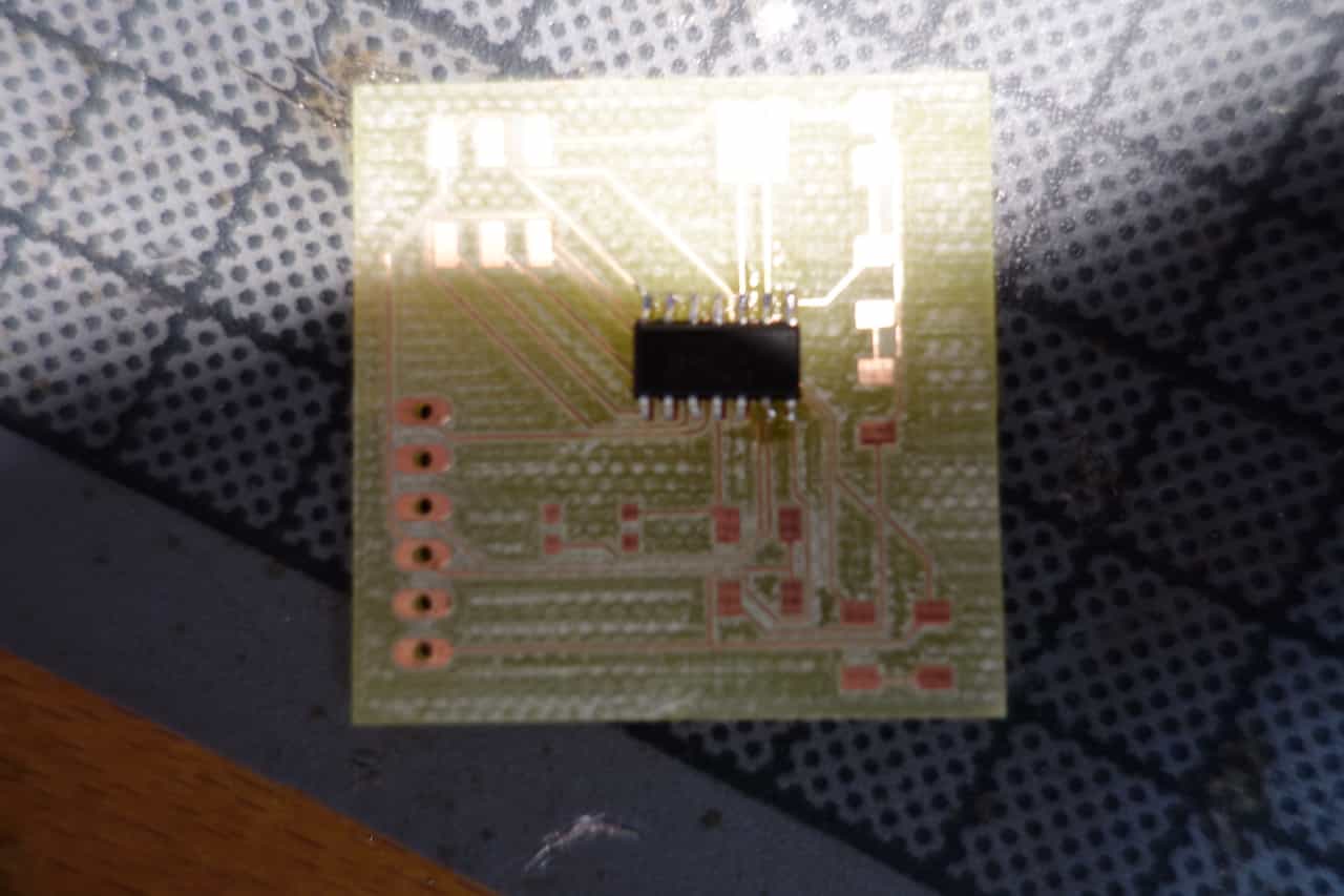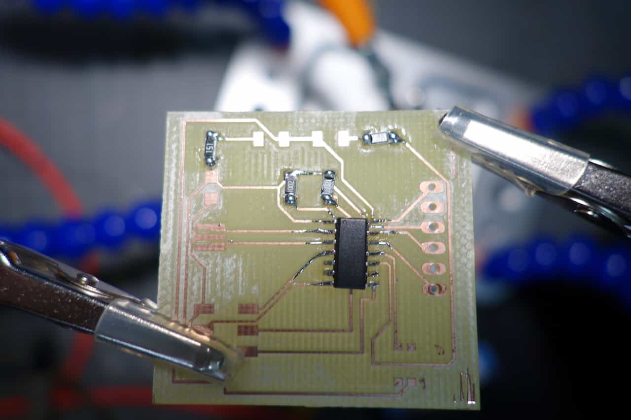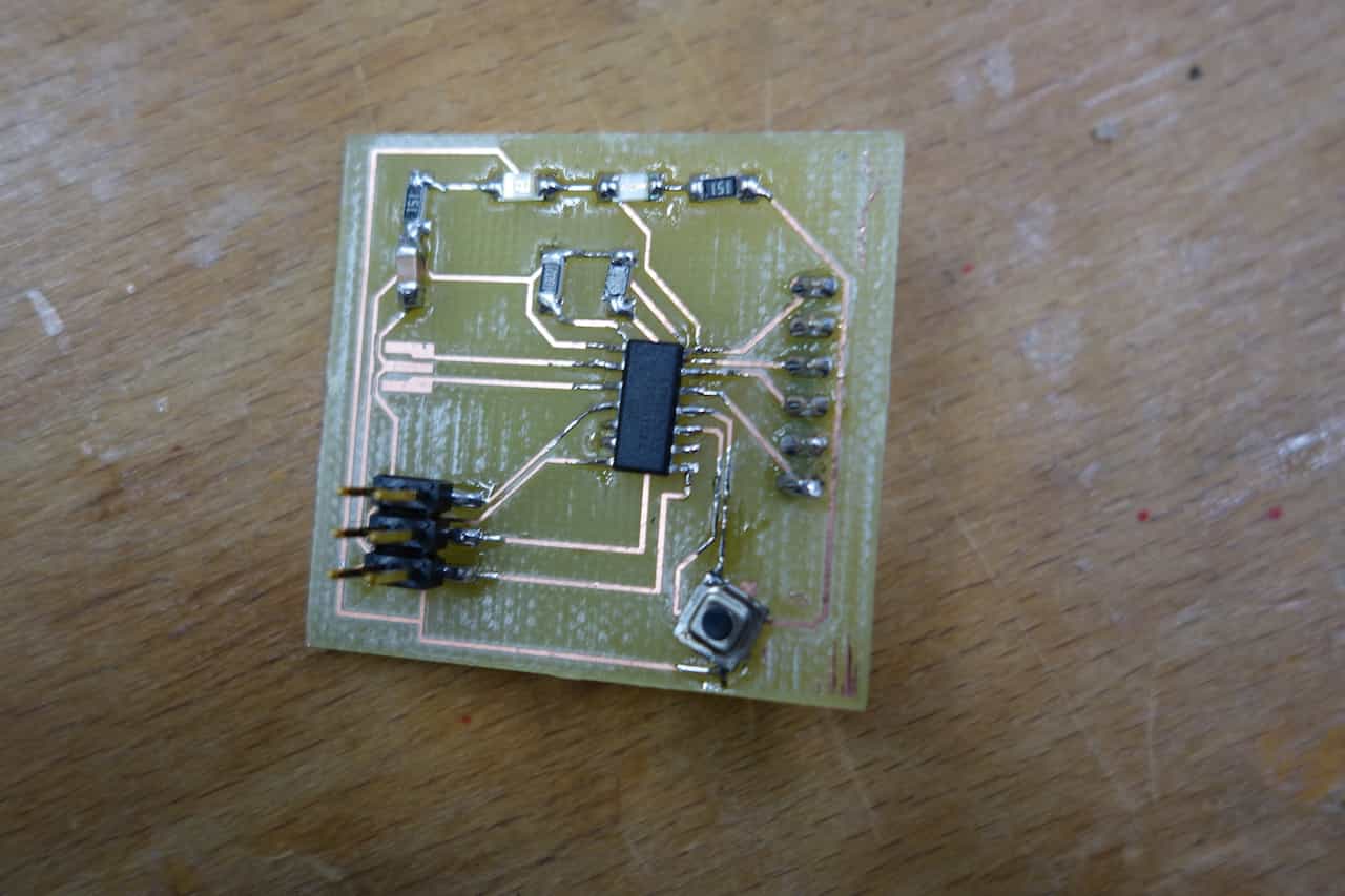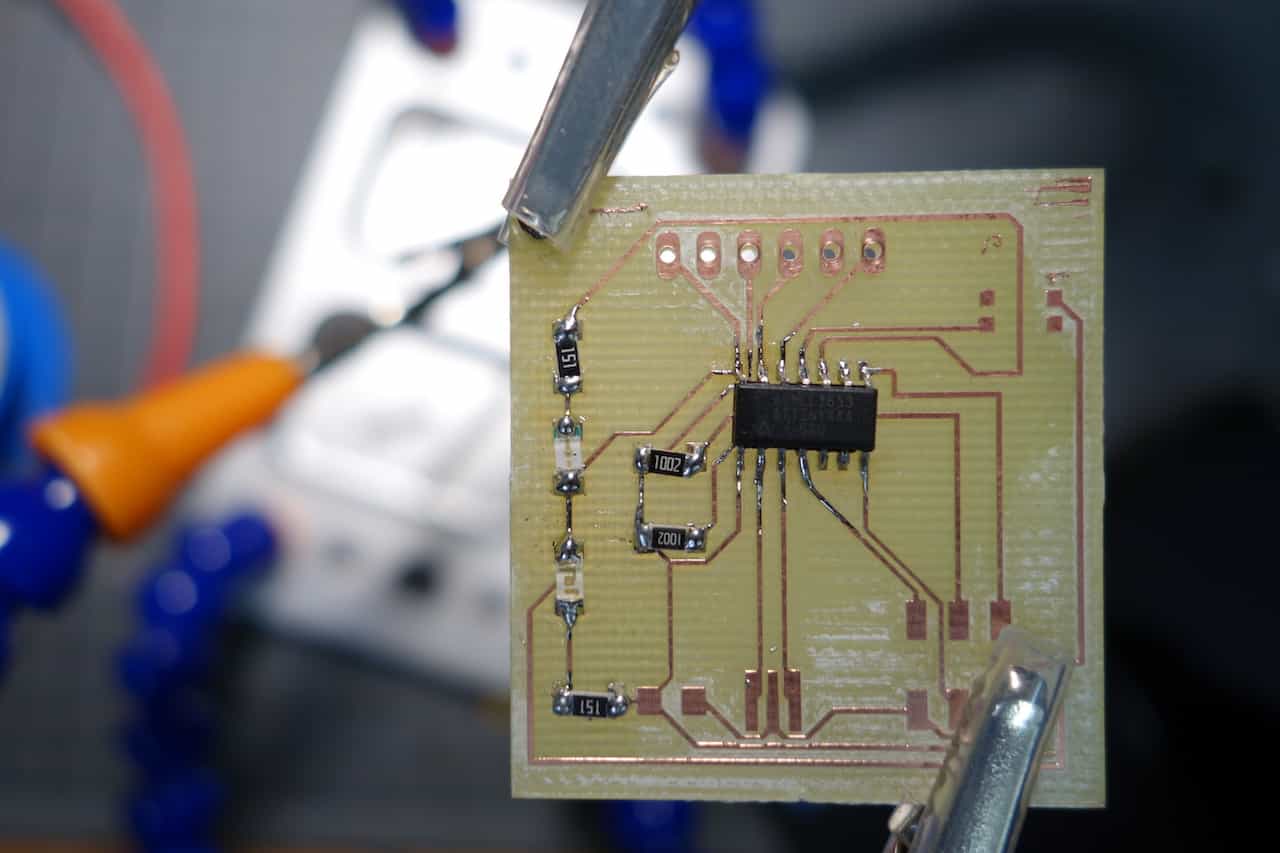 The process to fabricate this board reaches from designing the schematic and the board over milling it and finally solder the resulting PCB.
