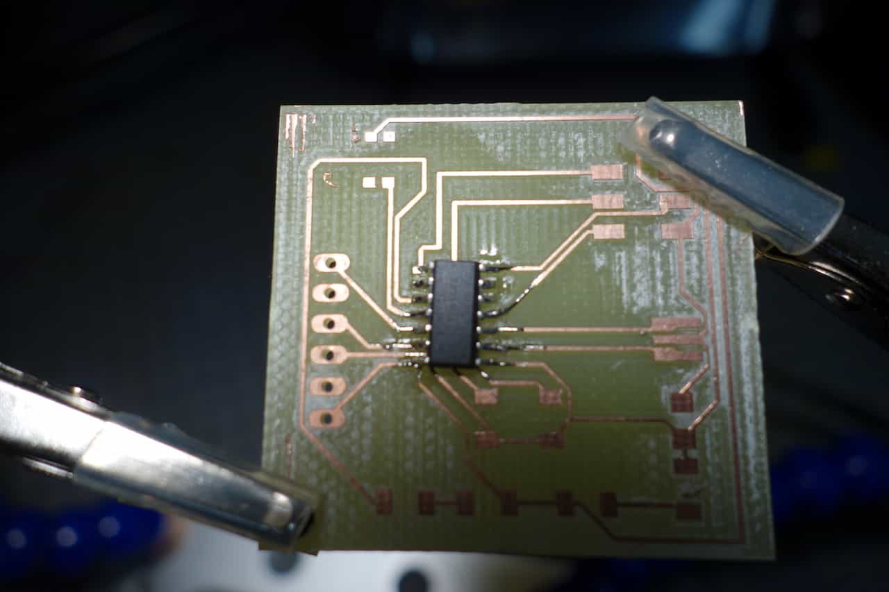 Like for the ISP-board I soldered the ATtiny first. Since it hast the thinnest legs and therefore the highest probability of screwing up.