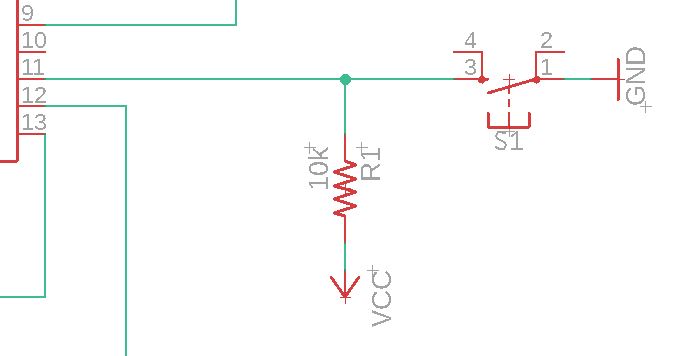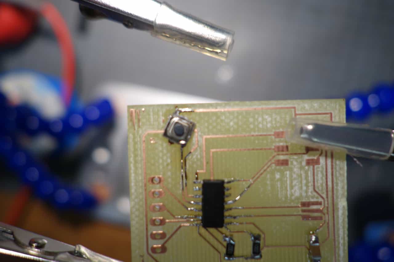 In the next step I added a button and pullup resistor to one of the free pins of the Attiny.The resistor is necessary so no shortcuts are produced.