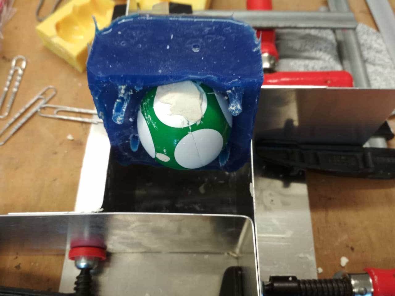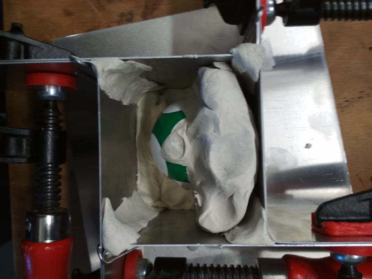 To make the second half of the mold I reassembled the metal mold and placed the mushroom an the first half inside of it.
