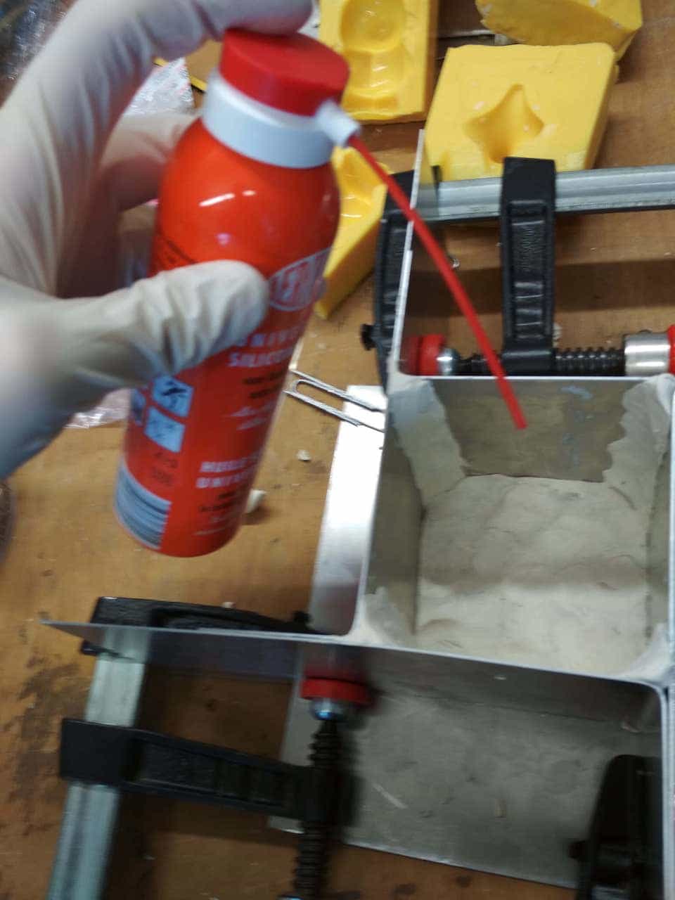 To prevent that the second half sticks to the first half of the mold apply some silicone-spray.(When in doubt if you have used enough apply just a little bit more)