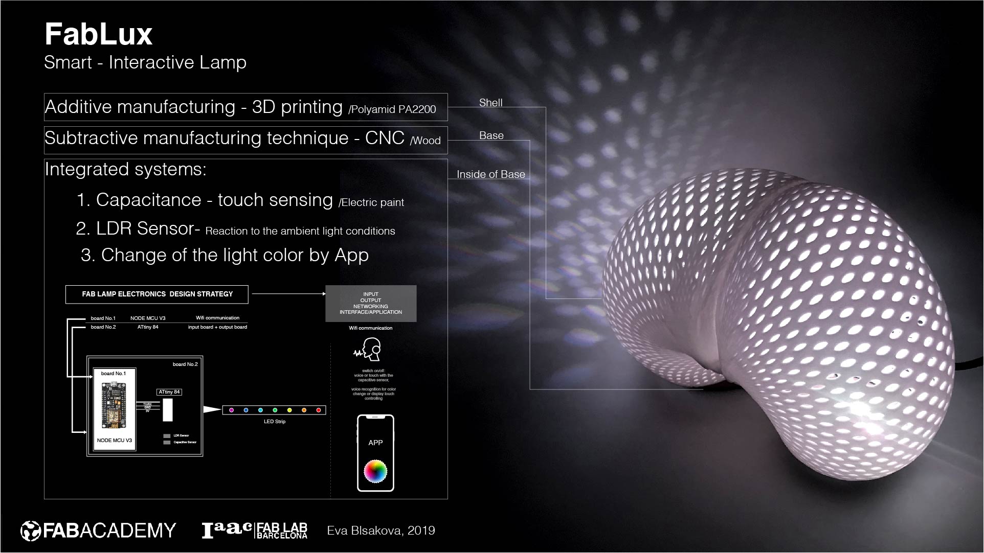 FabLux is the smart lamp that interacts with you, it reacts to your movement, when you touch it turns on/off, it is in equilibrium to the ambient light, when the sun goes down, the lamp turns on. Depending on the light intensity it changes also its brightness, temperature of the light....it also can change the color by using app and voice recognition. so now enjoy the darkness!