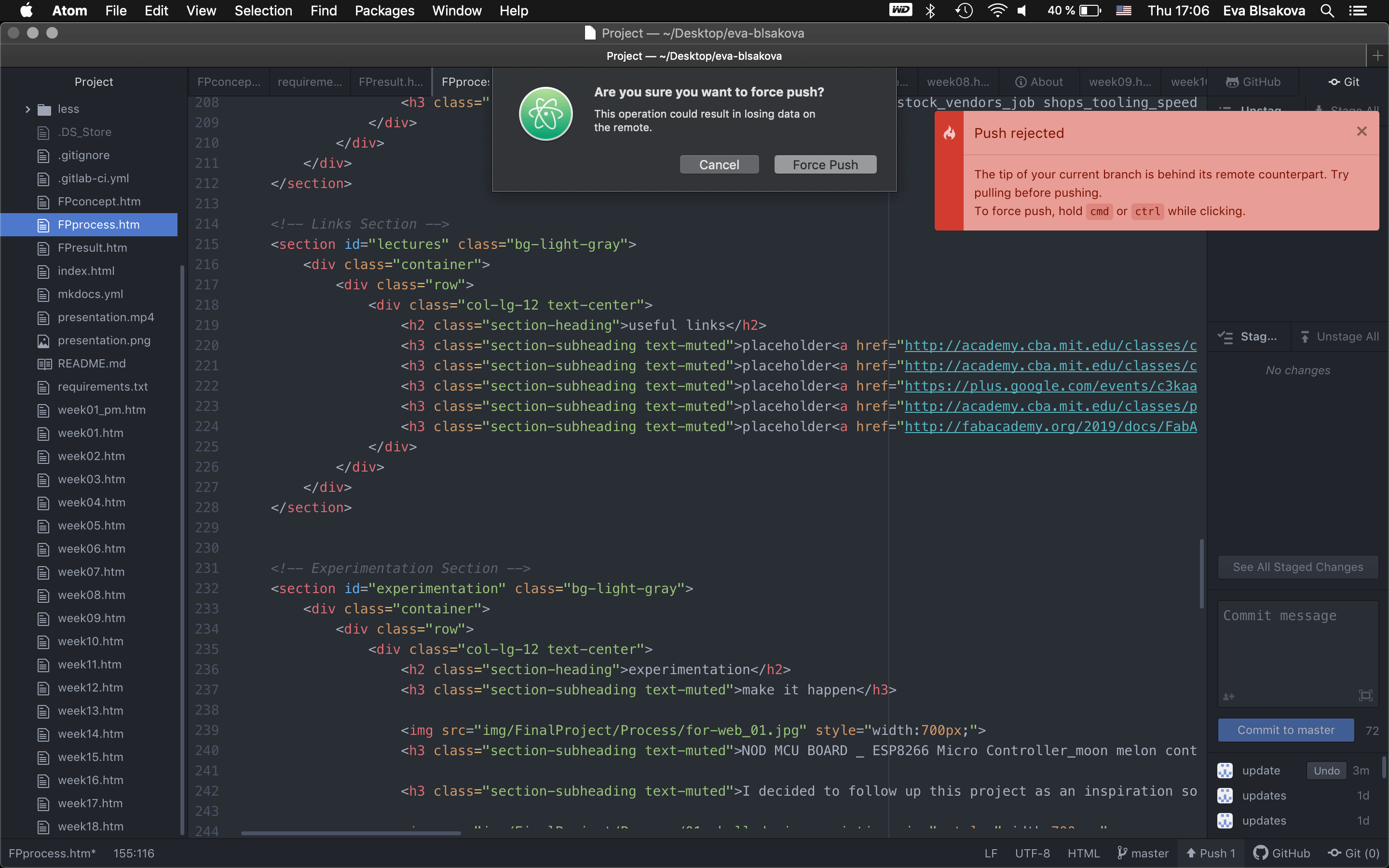 Understanding how to use atom means for me going troughout some tutorials_atom.io and also this tutorial helped me to understand, how atom can collaborate with git to be able to push updates on my website.