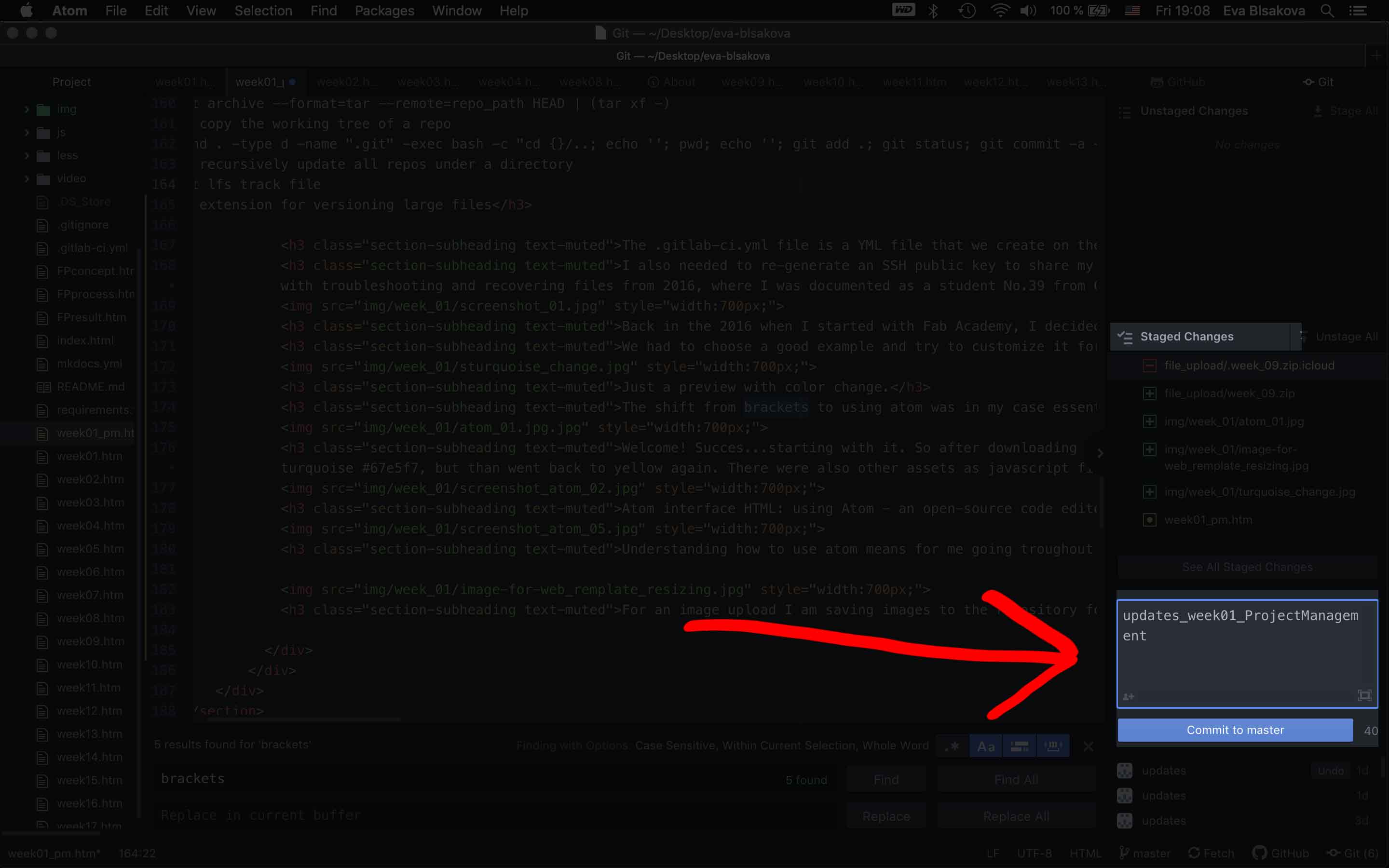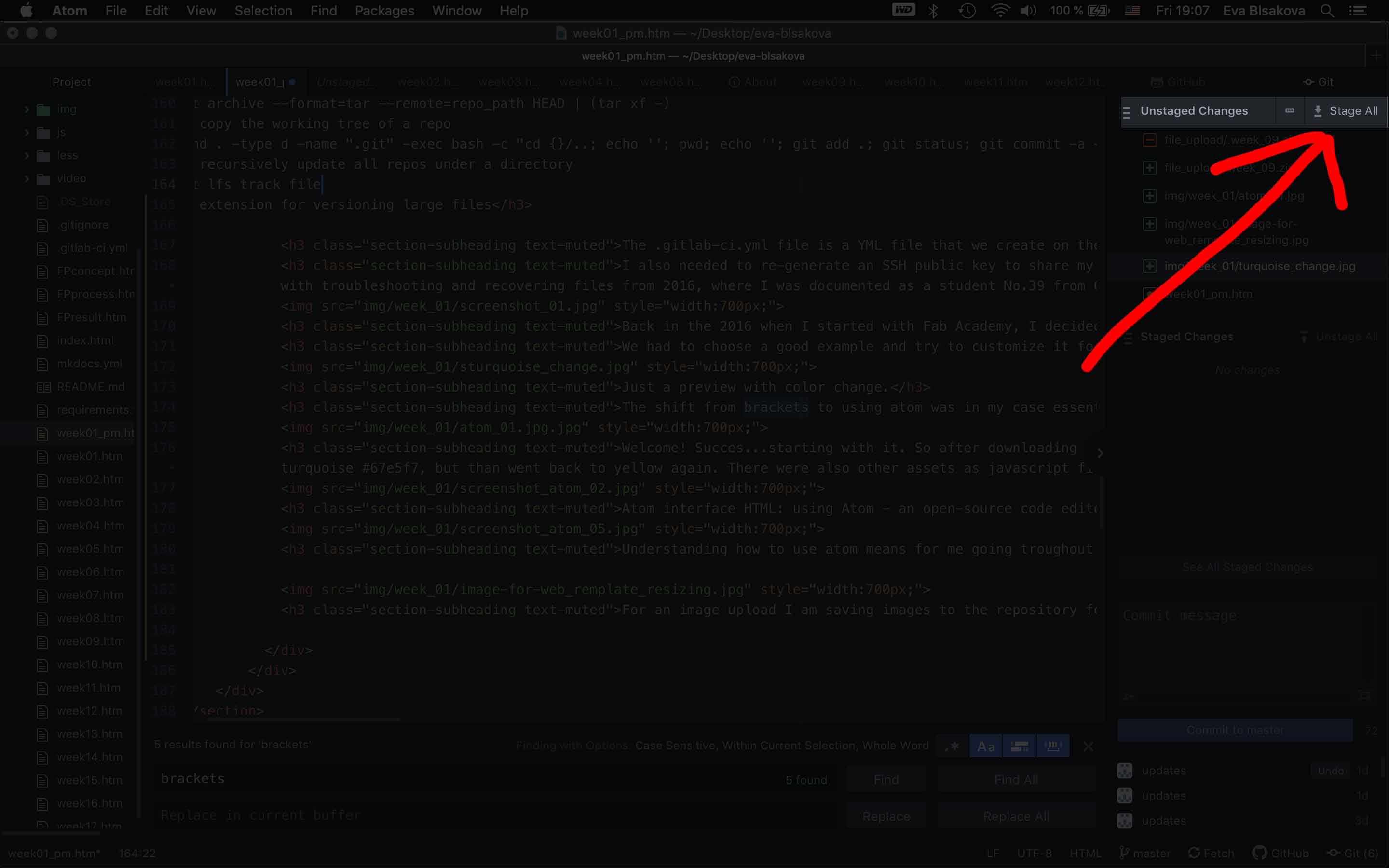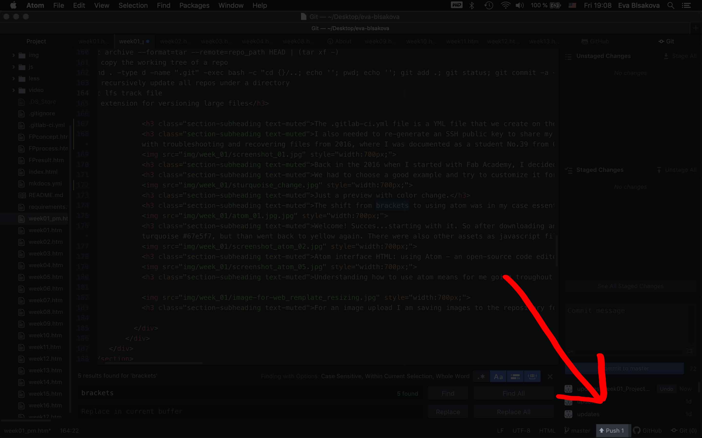 The shift from brackets to using atom was in my case essential. I would have to either reinstall new version of brackets or - thats what I decided - to learn new tool and so I installed atom as a main backbone structure to manage the documentation of my fab academy progress on my website.