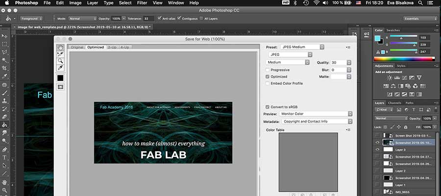 For an image upload I am saving images to the repository folder, to each weeks assignment, it is necessary to resize the images in according to keep the size of the web page low. Regarding the images for the website - those I adjust and resize in Adobe Photoshop. After wished img modifications, I go to File/Save for Web and I choose medium quality of the images. Or another online option how to reduce an image size is to upload them to this website and just download them. Easy.