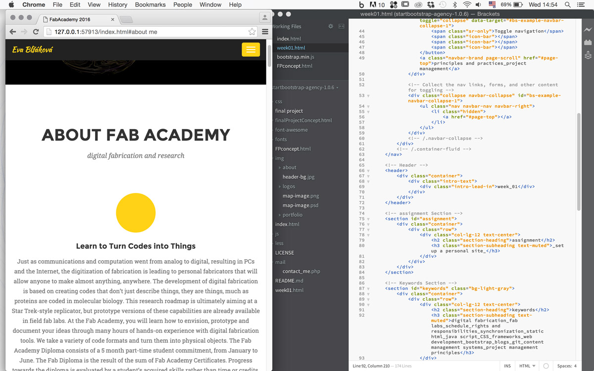 Back in the 2016 when I started with Fab Academy, I decided to use a text code editor for working out trough my HTML code using Brackets - an open-source code editor_brackets.io (brackets interface with live preview)