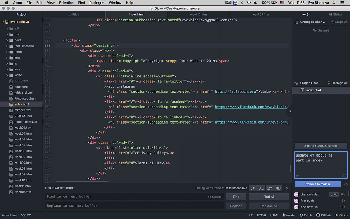 Welcome! Succes...starting with it. So after downloading and installing new code editor for html Atom I imported my repository folder from 2016 there. My previous repository folder from 2016 had various .html files - pages, for each weekly assignment, index, about, final project, where all the content is uploaded plus the .css stylesheet part of code, where the styles are defined. I played there with the color change from yellow to turquoise #67e5f7, but than went back to yellow again. There were also other assets as javascript files, but I didn't change them. Also a predefined img folder with all the images for the web page is there.