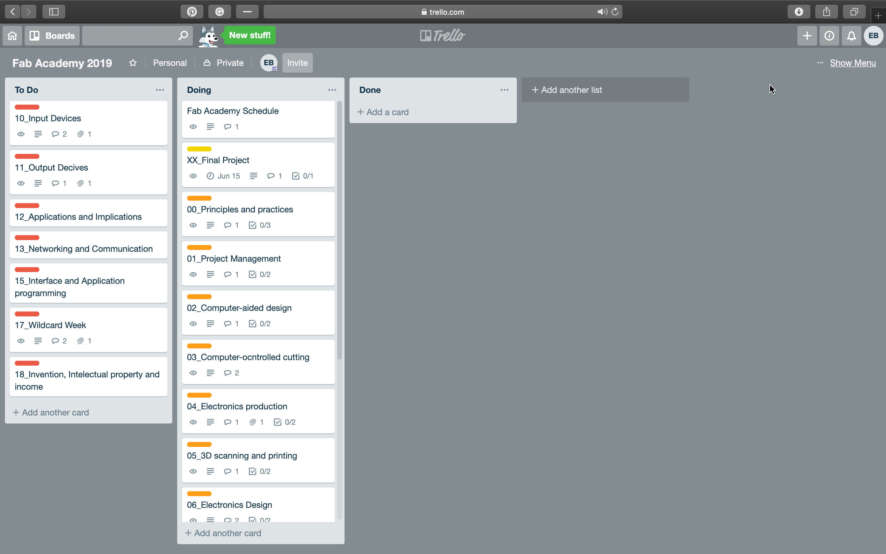 For better procedure of the whole Fab Academy programm I decided to use trello - a web-based list-making application for project management. First I logged in to my trello account and created a new board named Fab Academy 2019. I divided whole course according to the schedule with the weekly assignments, so I created a card for each week. Than I created 3 raws - To Do, Doing, Done and I will move cards from left row To Do to the right Done! Main source/input for everything in my website.