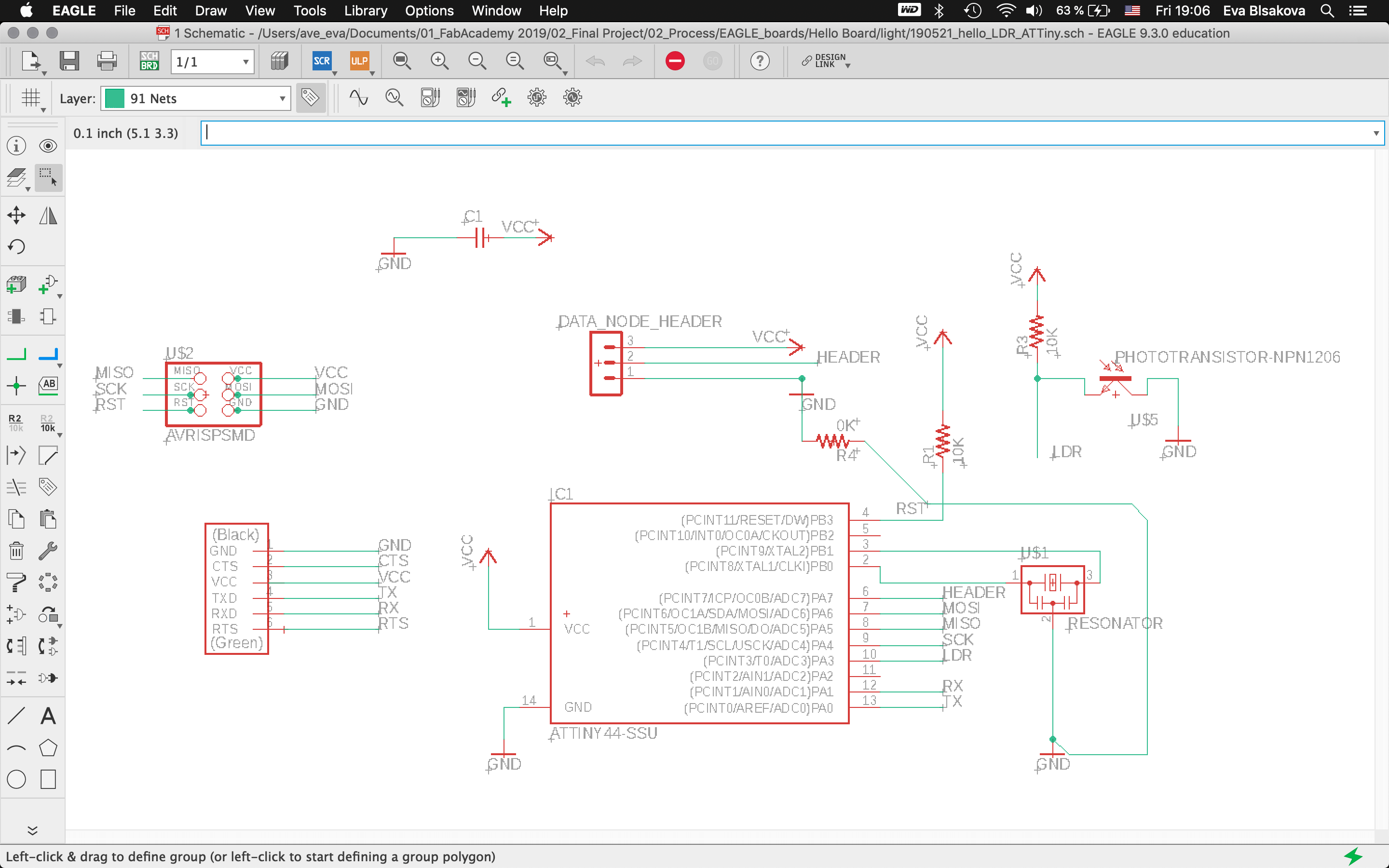 For step response/capacitance I worked with my existing hello board that I designed previously for testing my final project board with ATtiny84 microchip including LDR sensor. As a first step I checked few fab academy projects from past years and also had closer look at this tutorial. Capacitive sensing may be used in any place where low to no force human touch sensing is desirable. An Arduino and the library may be used to sense human touch through more than a quarter of an inch of plastic, wood, ceramic or other insulating material (not any kind of metal though), enabling the sensor to be completely visually concealed. My aim is to explore possibilities how to switch on/off my lamp using capacitance.