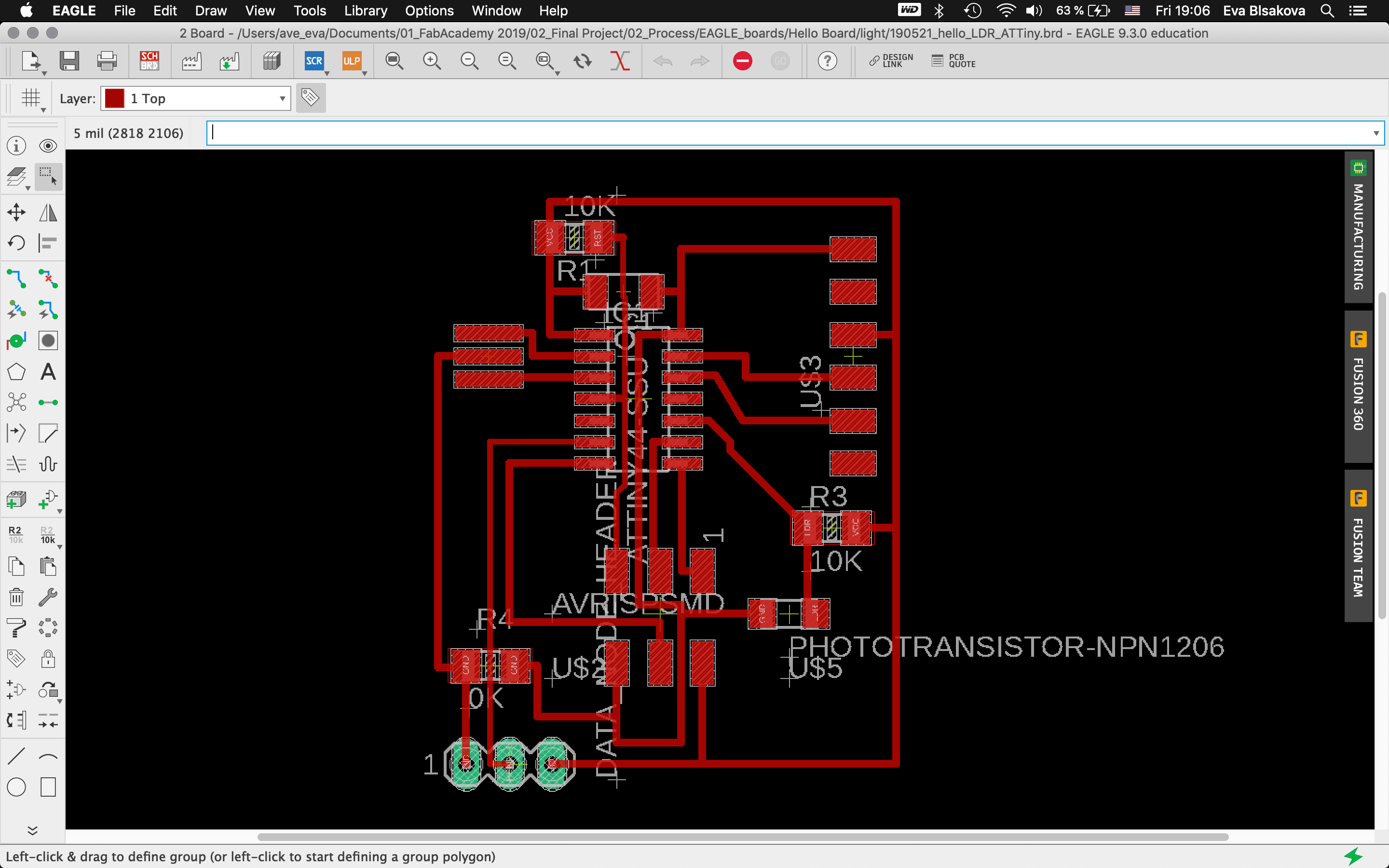 Next step, after discussing my final project with my instructors in FabLab, I decided to make something more alighned with the direction of my final project. Therefore I chose to make an another board including another input device - capacitive sensor /step response. I will implement it within one board to be able to control LED stripe when touched. For that I decided to switch to KiCad and followed the tutorial what we did in previous clases. But after I decided to go back to Eagle, I was more comfortable since I had previous skills already. Anyway, exploring KiCad SW and its possibilities was a very good excercise.