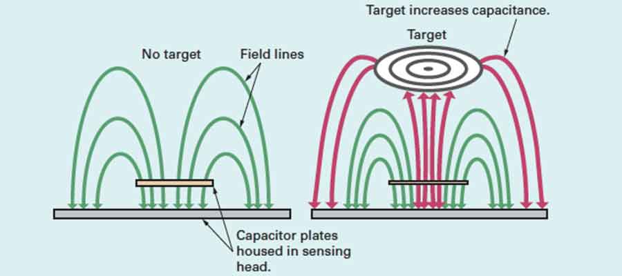 Capacitive sensing: - As a ferrous or nonferrous target enters the sensing zone, capacitance increases; circuit natural frequency shifts towards the oscillation frequency, causing amplitude gain.