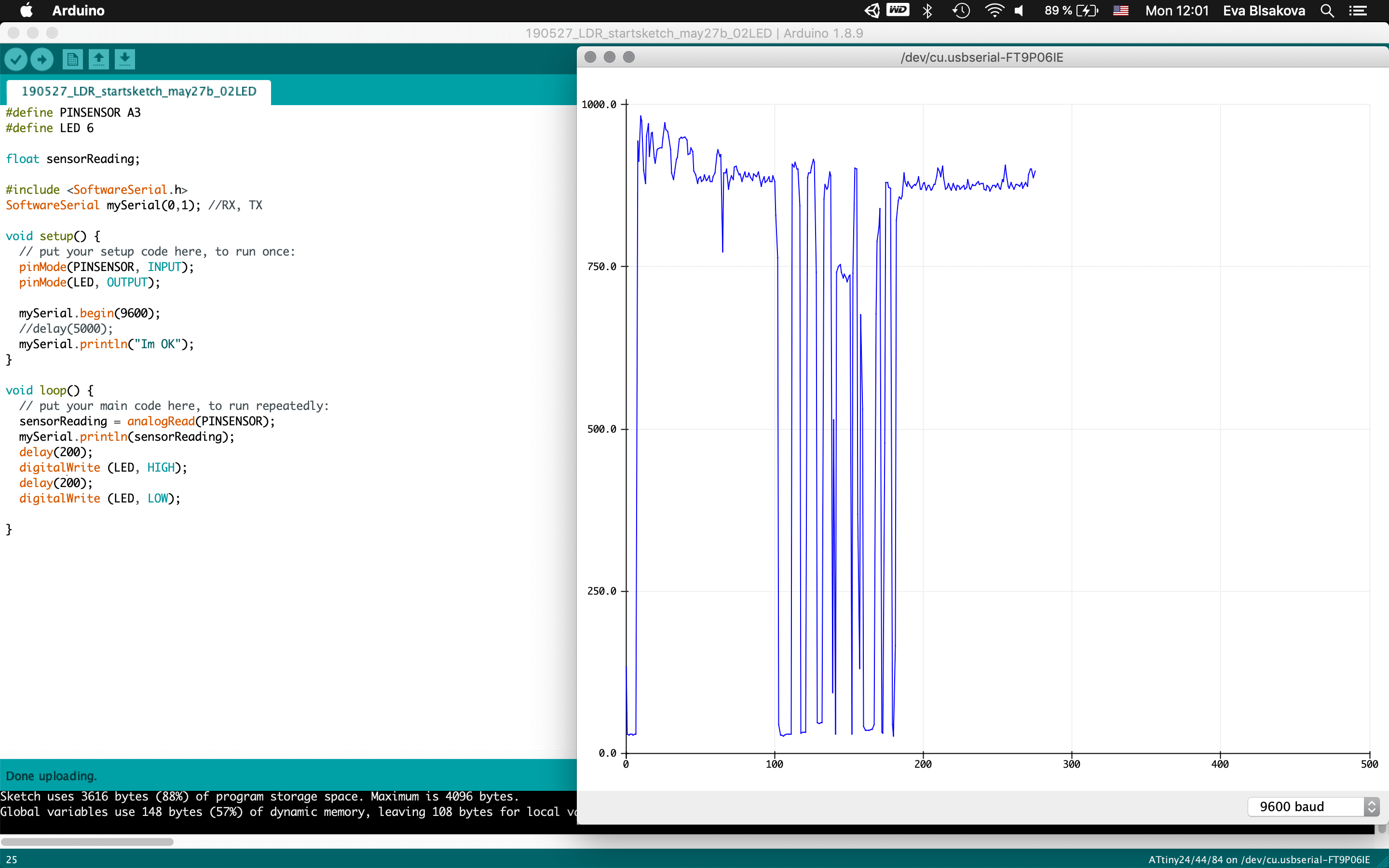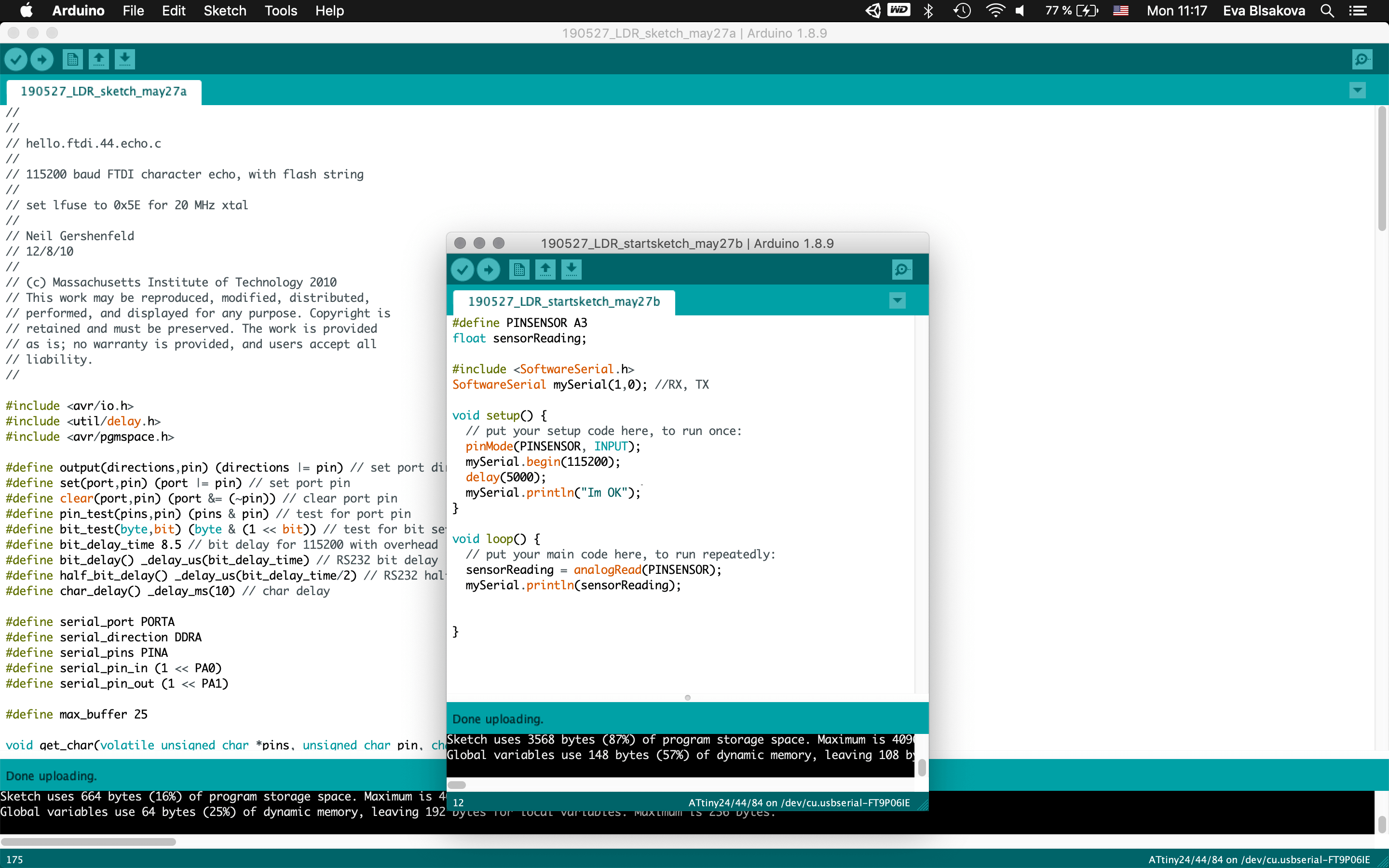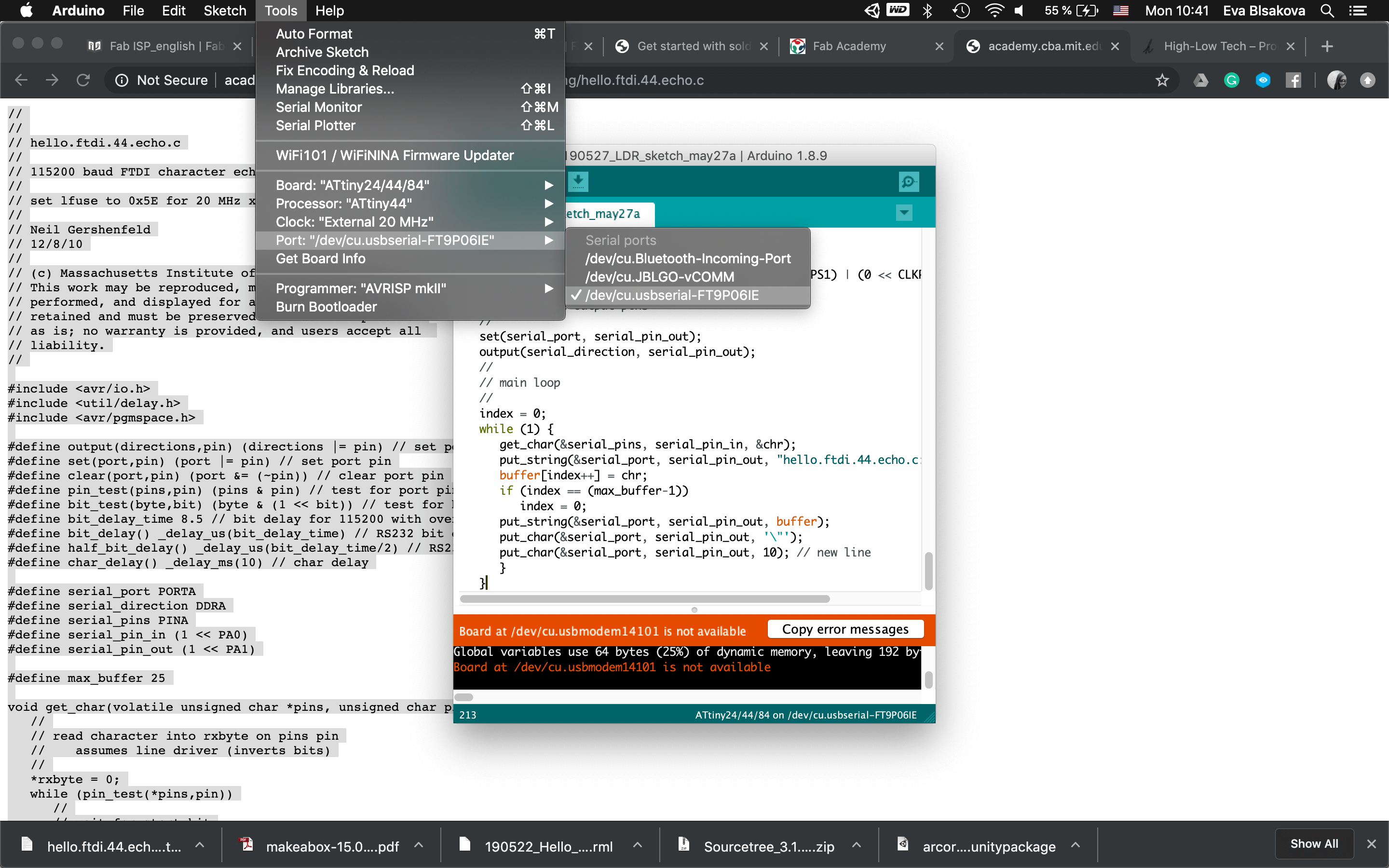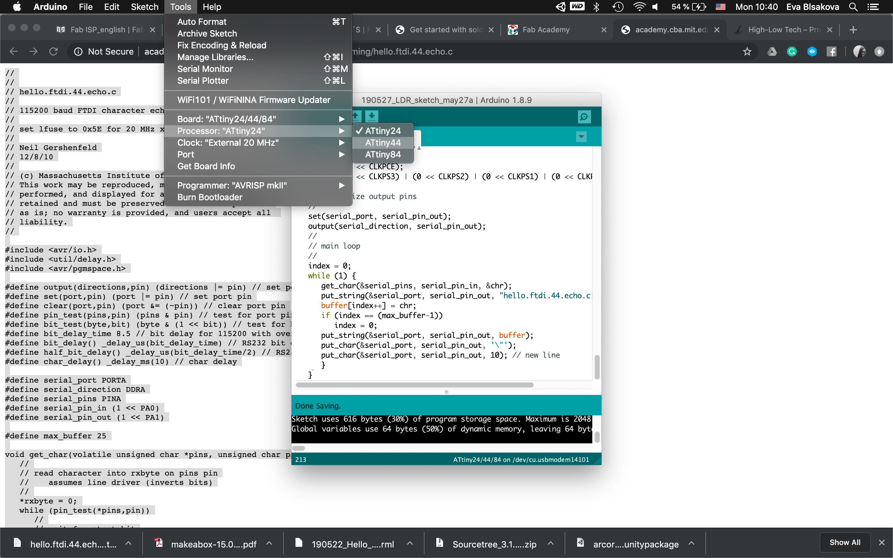 #programming LDR sensor:So connect the board with FTDI, ISP, check the ports, install libraries (this I did already when working on the upper mentioned tutorial)…Fisrt Burn Bootloader -if we want to make our micro-controller being programmable this is the first thing needs to be done before programming. Then I wrote the code using the Arduino IDE. Check the pins which are you connecting with your chip. For the code part - there were some examples already as you can see previously I tested the LDR sensor with the tutorial upper mentioned. This was working with the LED on the breadboard as for testing, my aim was to use a NeopixelLEDstrip for my final project and for that I had to use ATtiny84. So for next step I resoldered the chip and changed ATtiny44 for ATtiny84 to continue. Than the code part again. It was necessary to install neopixel libraries, the same way trough the Library manager inside the Arduino. it comes with premade sketch examples so I took one too and adjusted the code a bit. For using ATtiny84 it was needed to change Serial to mySerial and mySoftwareSerial all over the code. Checking connections to relevant pins and their usage. what pins is related to what task, check where is the connection for LDR and LEDstrip…Than calibration of the sensor part… It's pretty simple, it reads the value from the LDR and if it's below 975 it lights up the LED. Why 975? I tested the LDR by reading and printing the values on serial monitor it reads and I noticed when I cover the LDR the values are always below 975. The process you can see screenshoted below and at the end there is also a video demonstrtion. As you can see this part of the assignment is also related to my output design week and following to the final project, so check them out to get more insights!