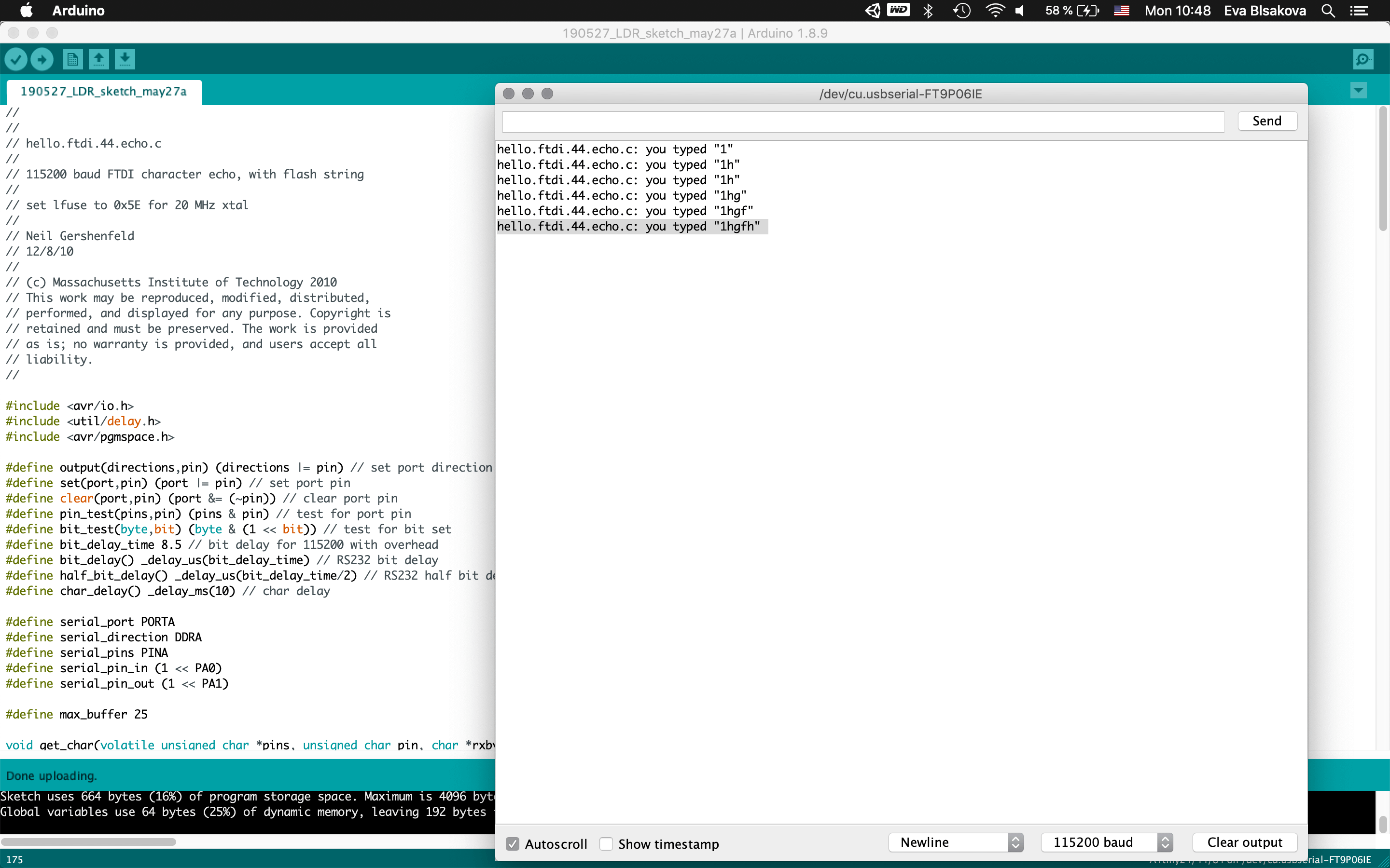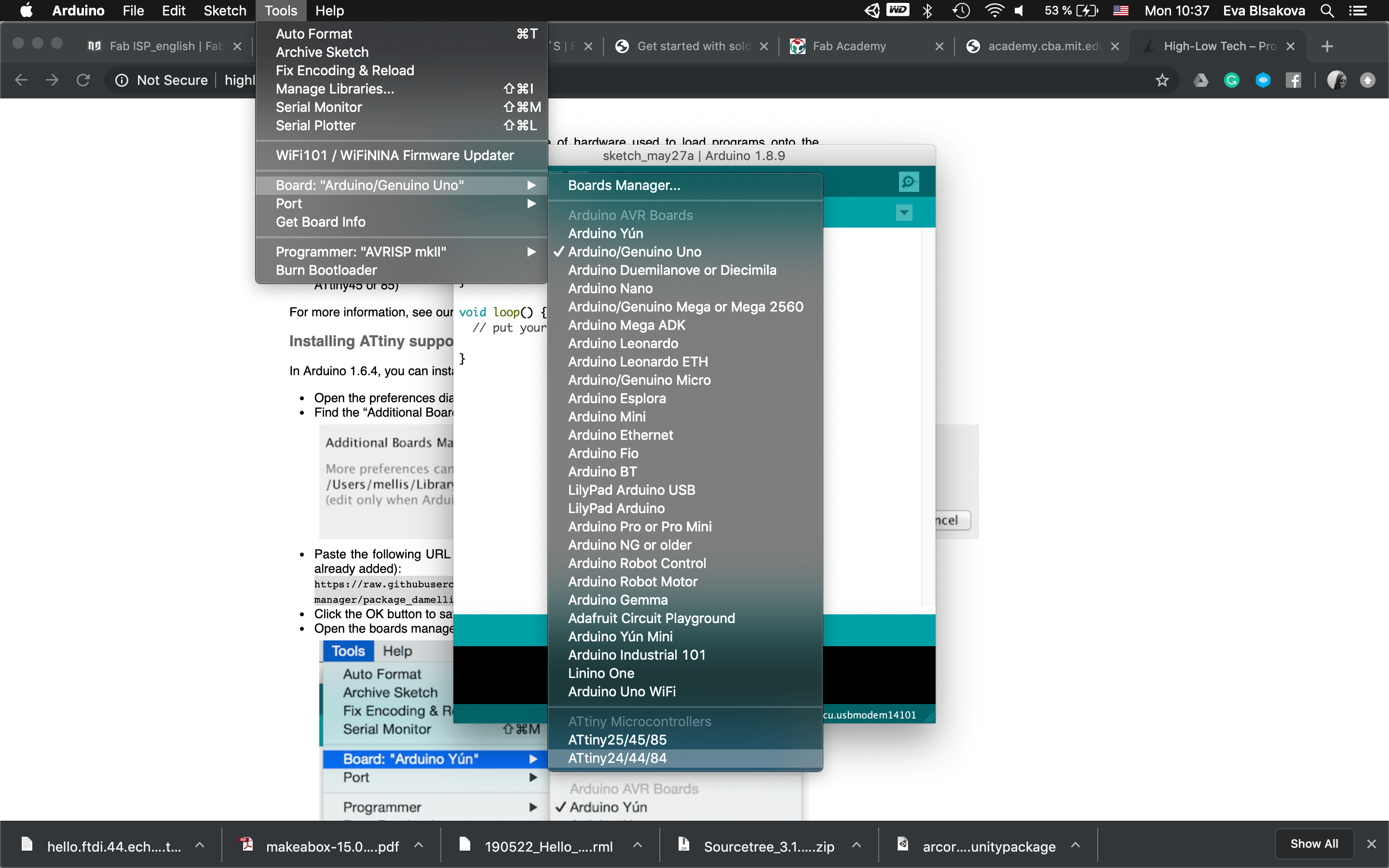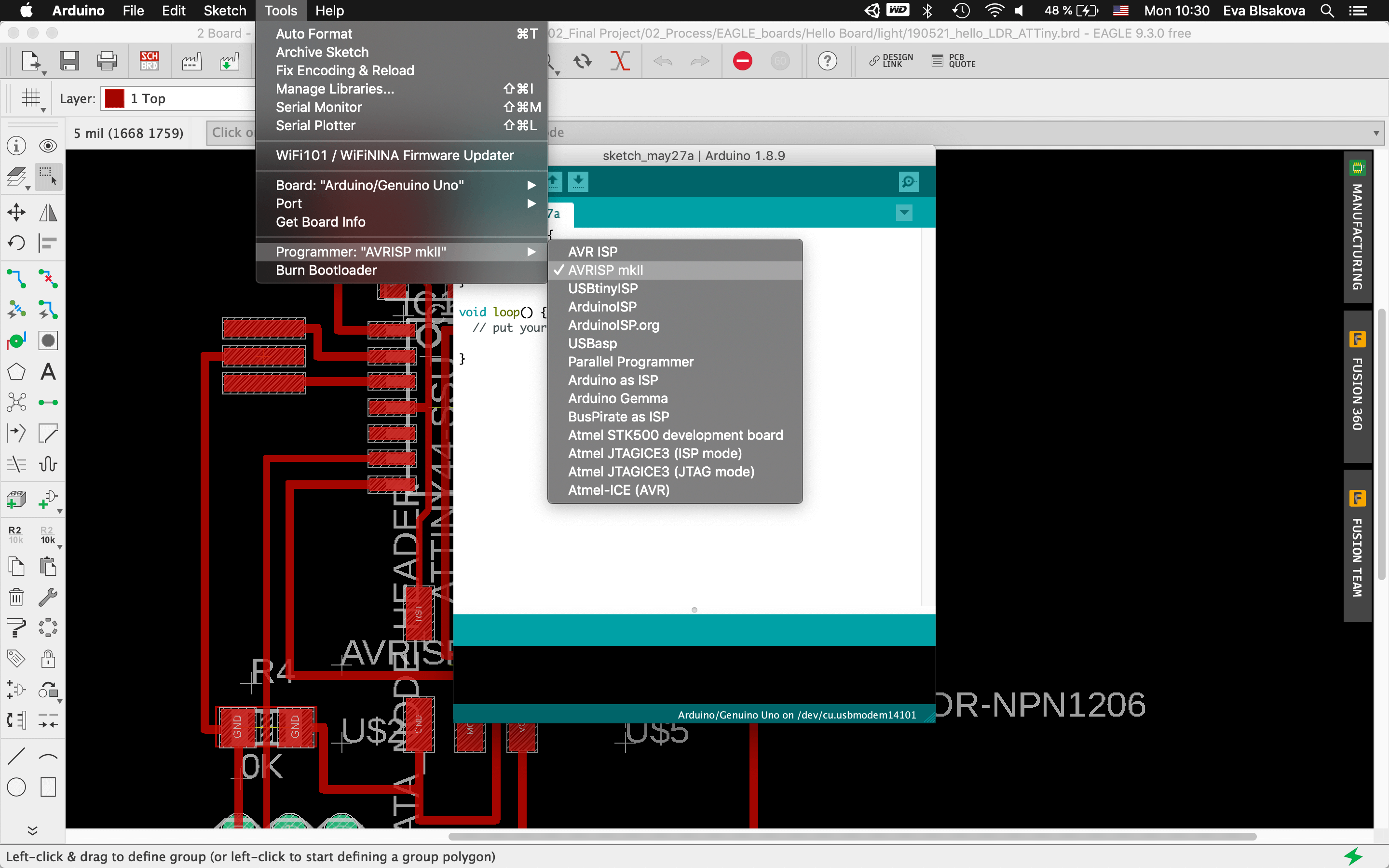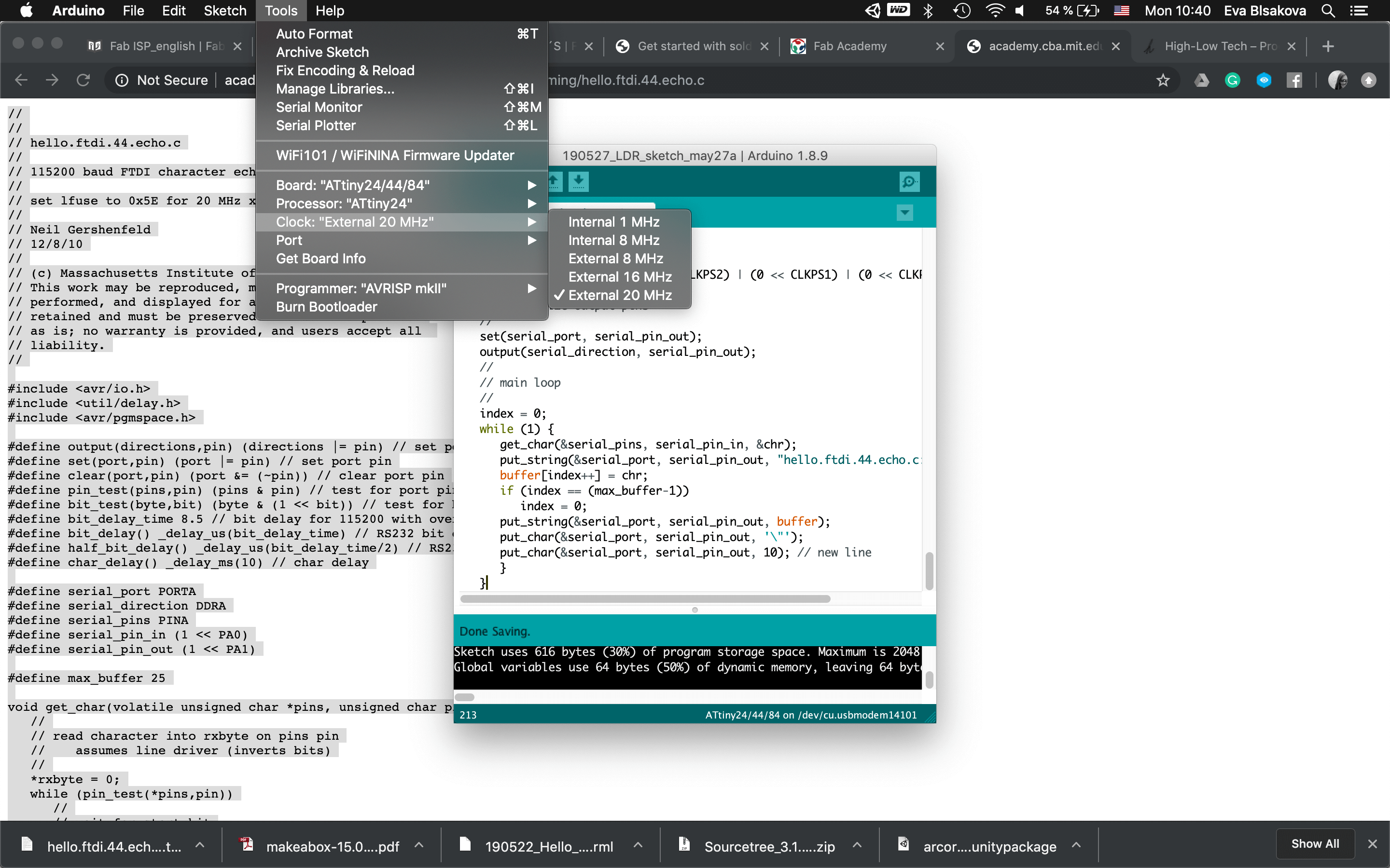 #programming LDR sensor:So connect the board with FTDI, ISP, check the ports, install libraries (this I did already when working on the upper mentioned tutorial)…Fisrt Burn Bootloader -if we want to make our micro-controller being programmable this is the first thing needs to be done before programming. Then I wrote the code using the Arduino IDE. Check the pins which are you connecting with your chip. For the code part - there were some examples already as you can see previously I tested the LDR sensor with the tutorial upper mentioned. This was working with the LED on the breadboard as for testing, my aim was to use a NeopixelLEDstrip for my final project and for that I had to use ATtiny84. So for next step I resoldered the chip and changed ATtiny44 for ATtiny84 to continue. Than the code part again. It was necessary to install neopixel libraries, the same way trough the Library manager inside the Arduino. it comes with premade sketch examples so I took one too and adjusted the code a bit. For using ATtiny84 it was needed to change Serial to mySerial and mySoftwareSerial all over the code. Checking connections to relevant pins and their usage. what pins is related to what task, check where is the connection for LDR and LEDstrip…Than calibration of the sensor part… It's pretty simple, it reads the value from the LDR and if it's below 975 it lights up the LED. Why 975? I tested the LDR by reading and printing the values on serial monitor it reads and I noticed when I cover the LDR the values are always below 975. The process you can see screenshoted below and at the end there is also a video demonstrtion. As you can see this part of the assignment is also related to my output design week and following to the final project, so check them out to get more insights!