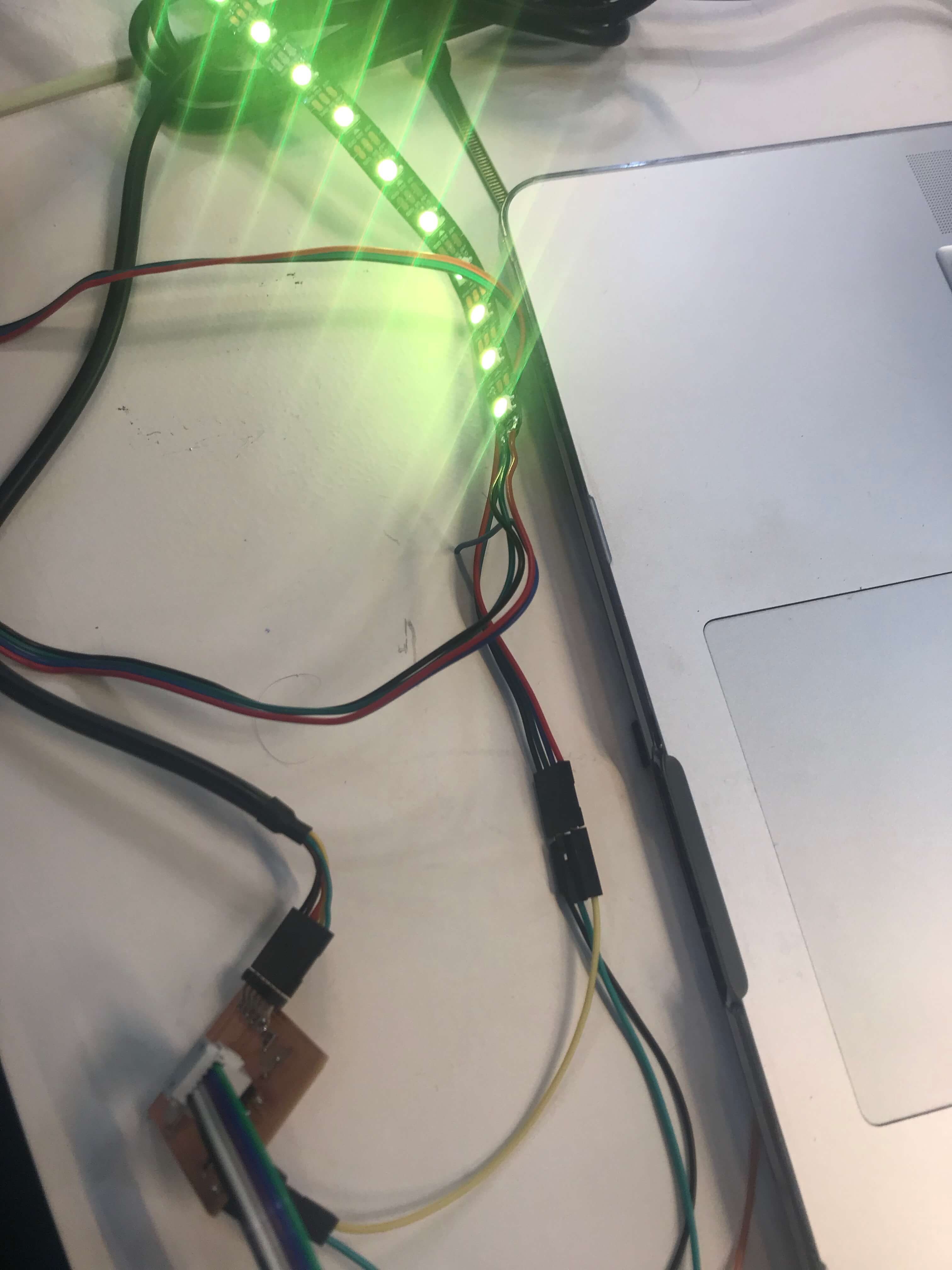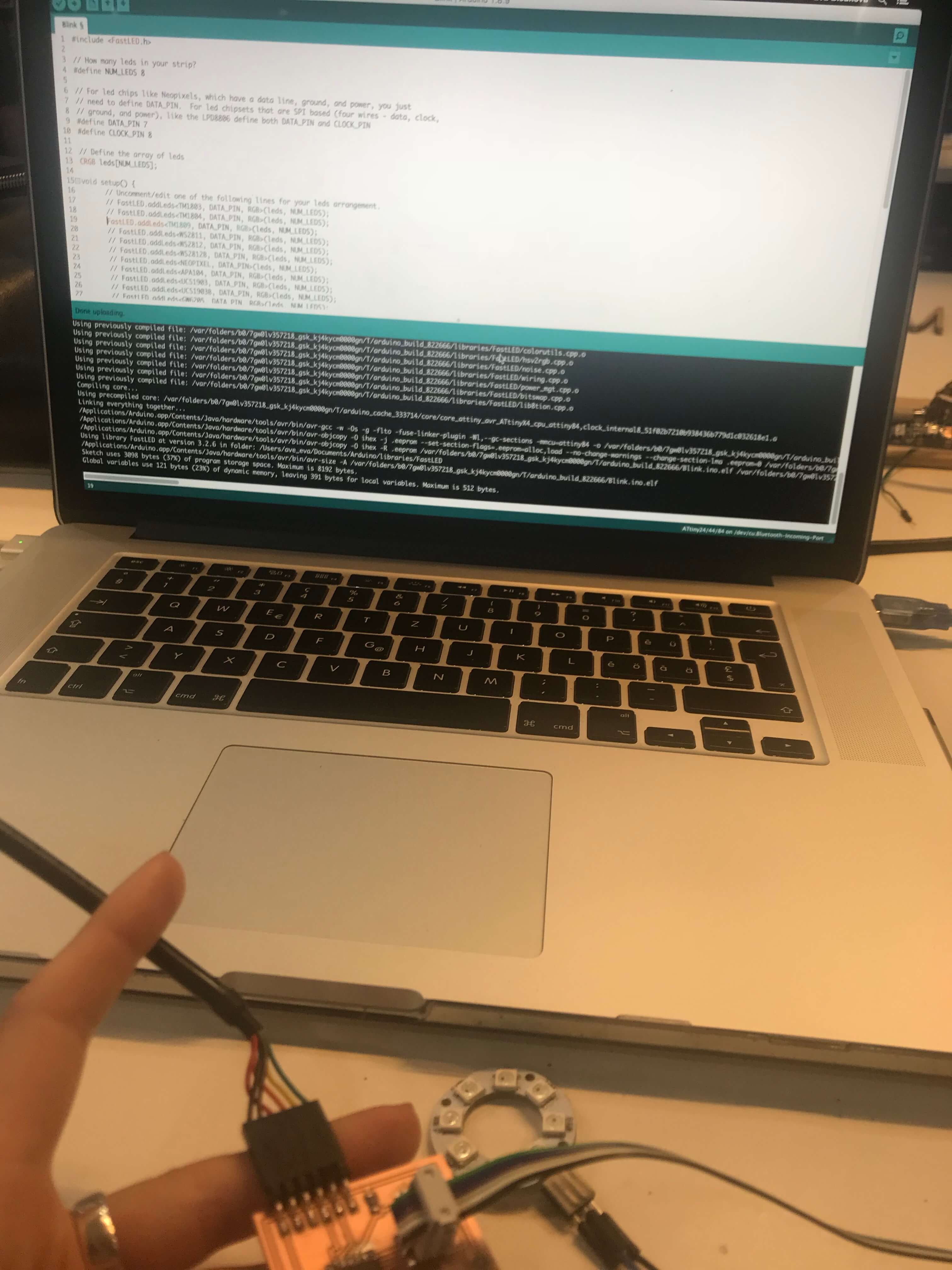 As I already installed the libraries and burned the bootloader last week, I dont have to do it now... It was important to focus on the neopixel output part. Than the code part again. It was necessary to install neopixel libraries, the same way trough the Library manager inside the Arduino. it comes with premade sketch examples so I took one too and adjusted the code a bit. Antoher point was the frequency of the clock. Neopixel are made to be used at 8MHz or 16MHz the code cannot compile unless I set 8Mhz (internal) as fuse (bootloader). For using ATtiny84 it was needed to change Serial to mySerial and mySoftwareSerial all over the code. Checking connections to relevant pins and their usage. what pins is related to what task, check where is the connection for LDR and LEDstrip…Than calibration of the sensor part… It's pretty simple, it reads the value from the LDR and if it's below 975 it lights up the LED. Why 975? I tested the LDR by reading and printing the values on serial monitor it reads and I noticed when I cover the LDR the values are always below 975. The process you can see screenshoted below and at the end there is also a video demonstrtion.