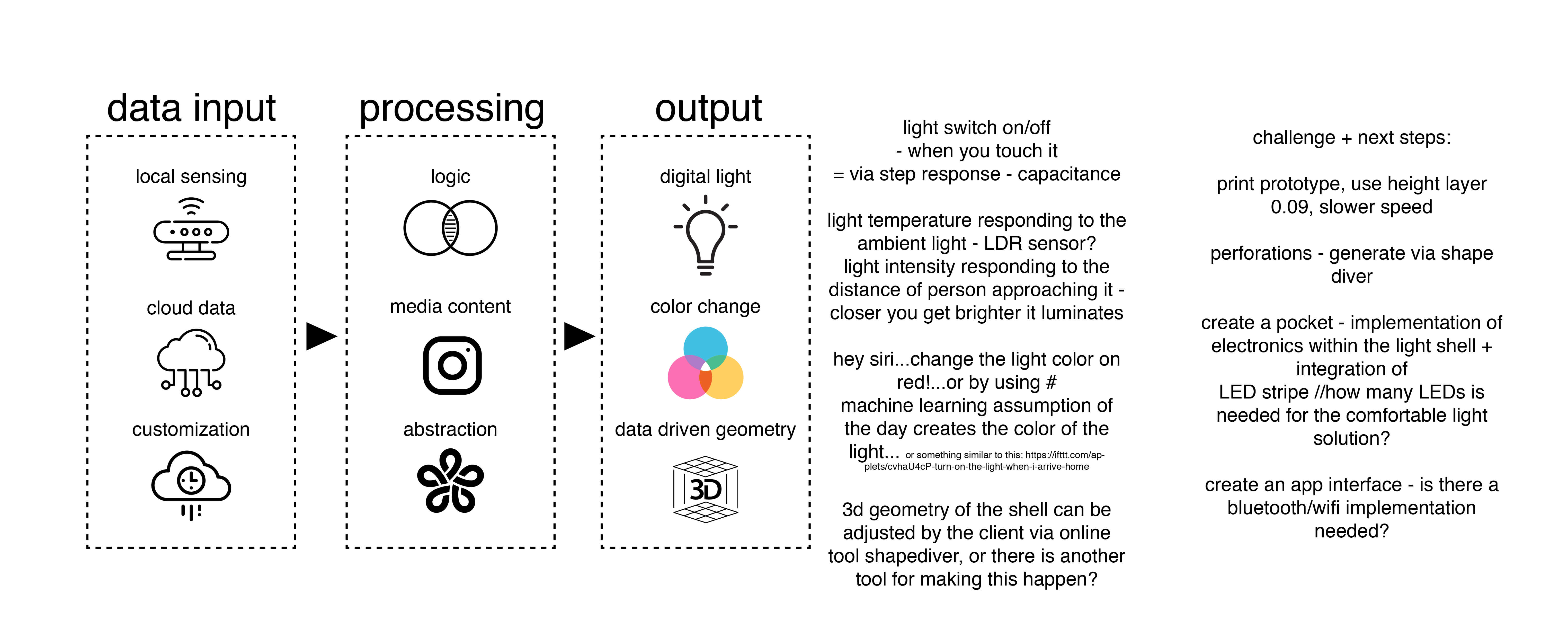 light which geometrical form is informed by the environmental data using smart citizen kit which lighting intensity is reacting e.g. to the distance, motion, color change according to the ambient light and distance? sound???///get smart citizen kit>create a customized geometry in SW>3d print body>manufacture electronics>>>>one lamp body to the field of lamp light bodies....light choreography...