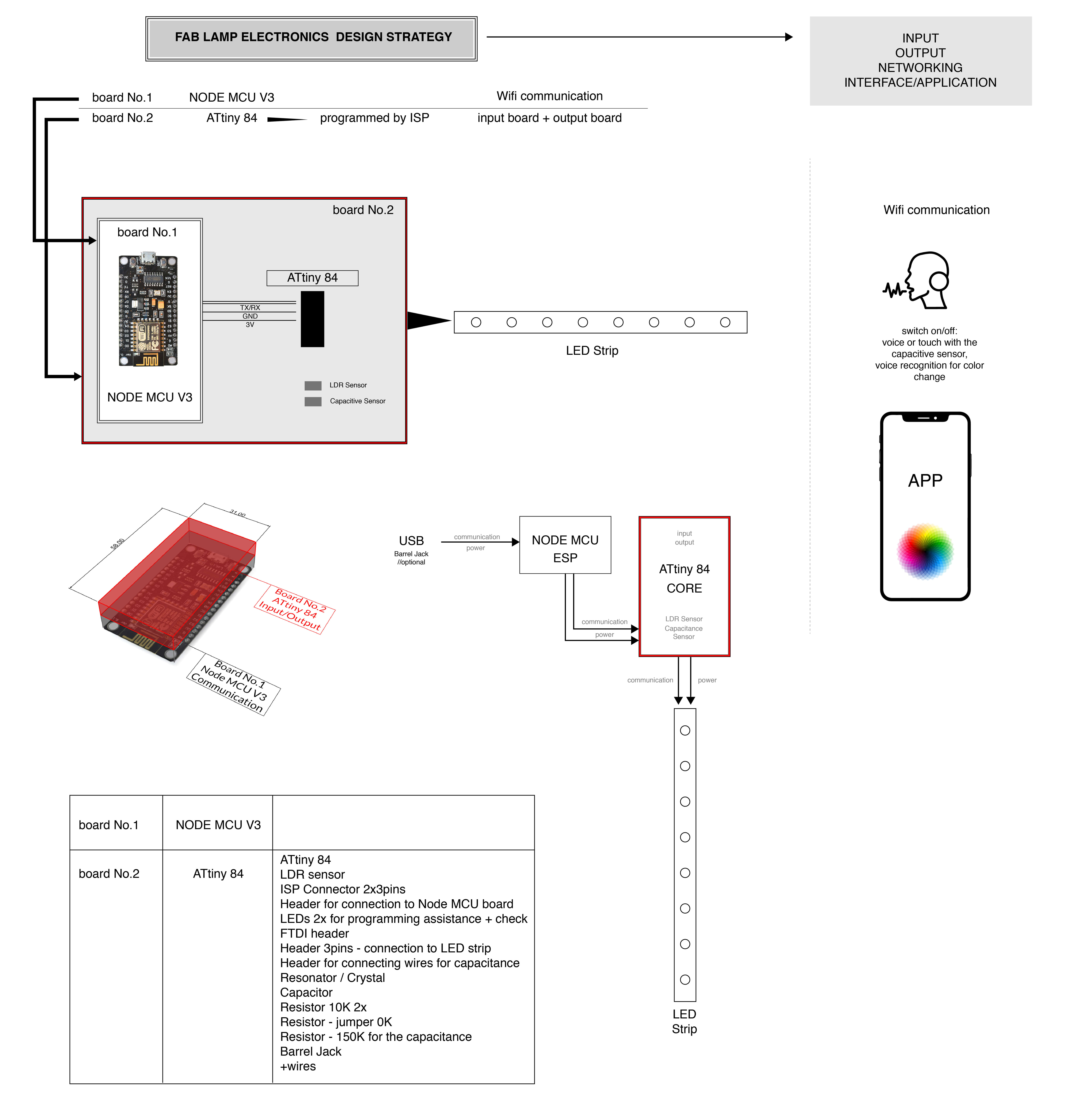 1. Design - Shell of the lamp created by additive manufacturing - 3D printing, Base for the lamp created by subtractive manufacturing -CNC process, 2. Electronics - PCB board with input+output and programming them, 3. Application for controlling the light color.