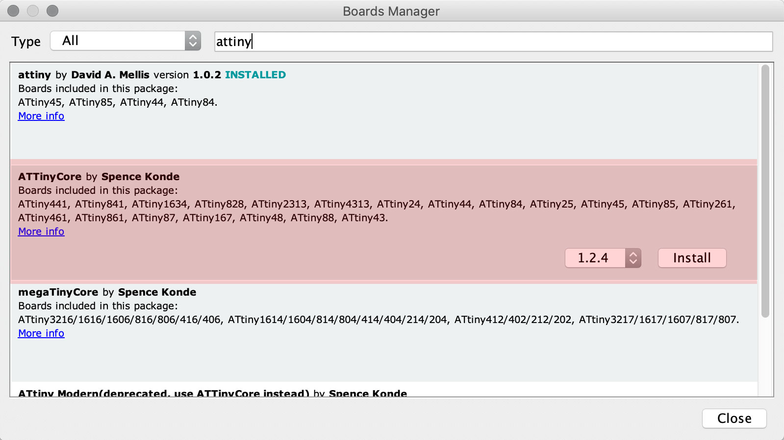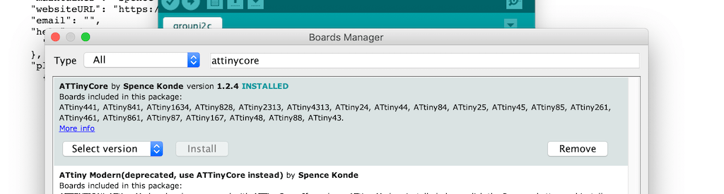 Since we’ll be using Attiny44s and it doesn’t support the Arduino wire library. The first step is to add the AttinyCore from this link to arduino, then install it on the boards manager.