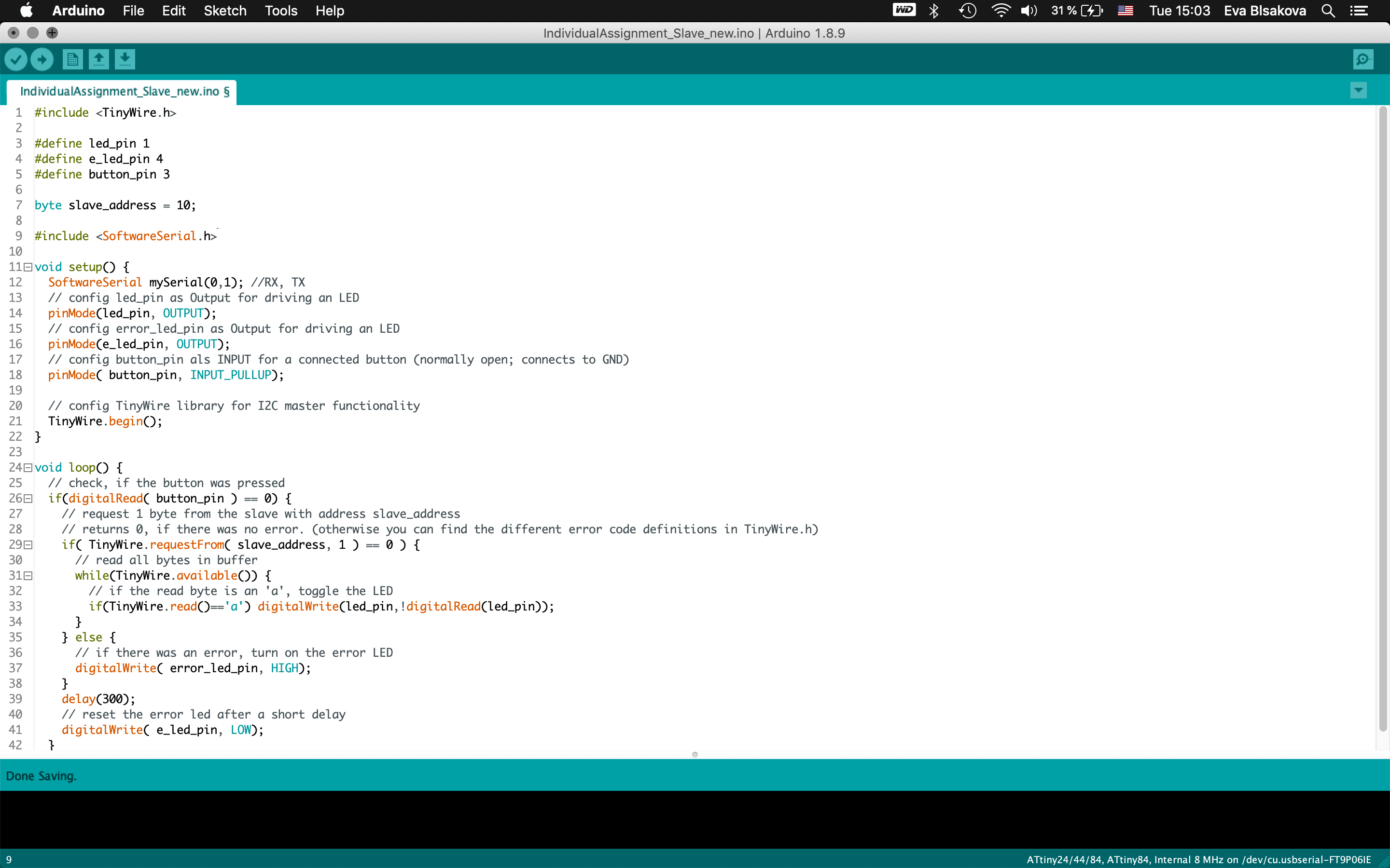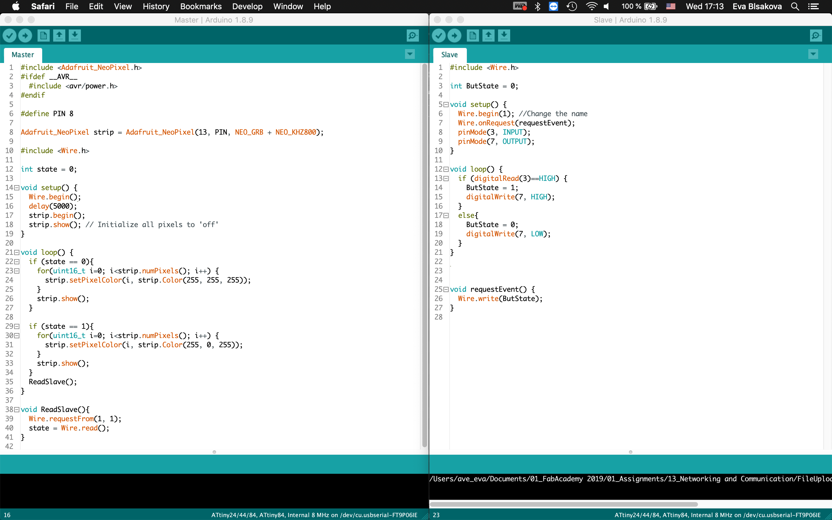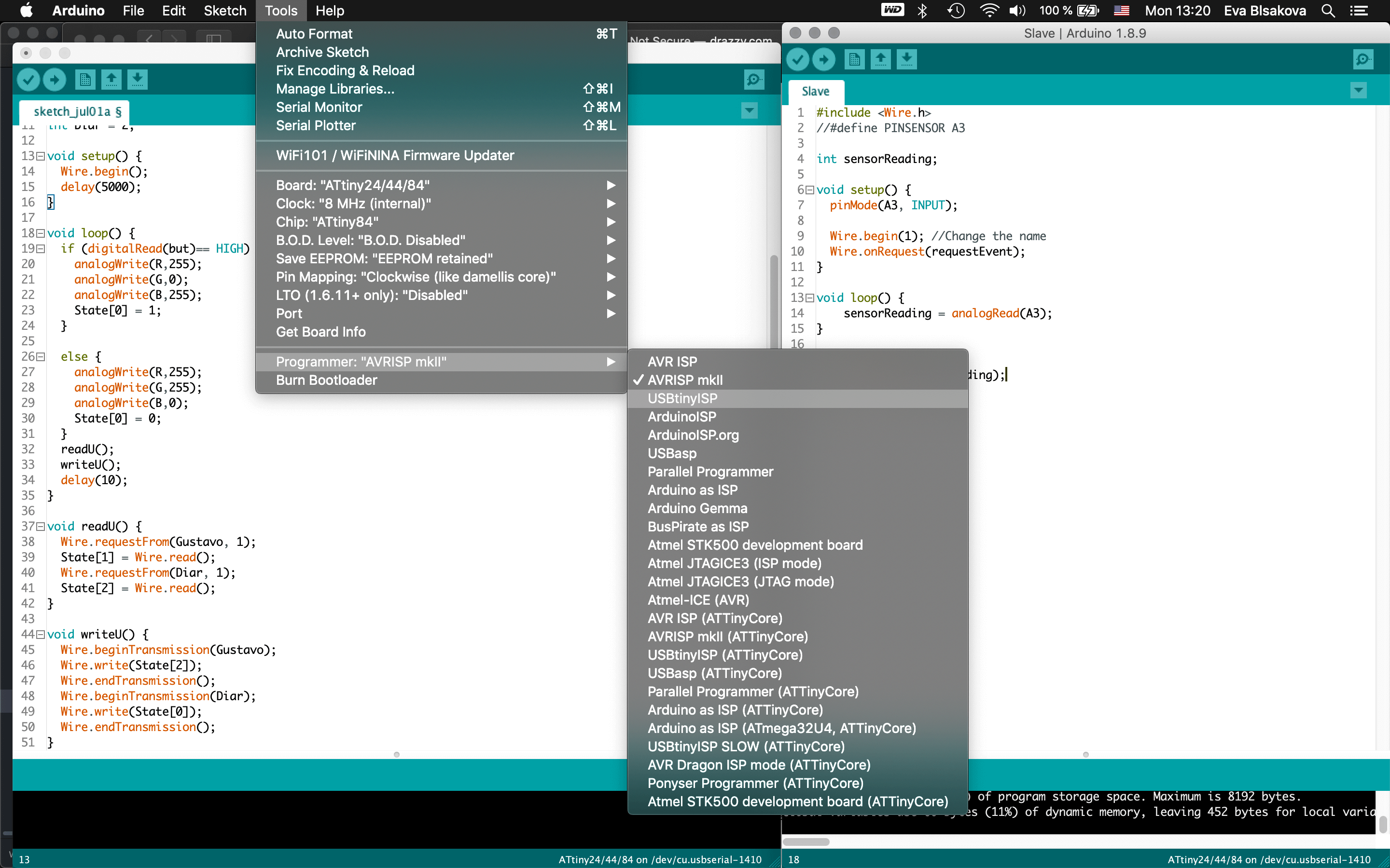 After I started to explore how I can make it happend with my board. First Test - so one Board (I borrowed Josephs) as a master and was adjusting everything to make work with my board for final project with ATtiny84 as a slave.