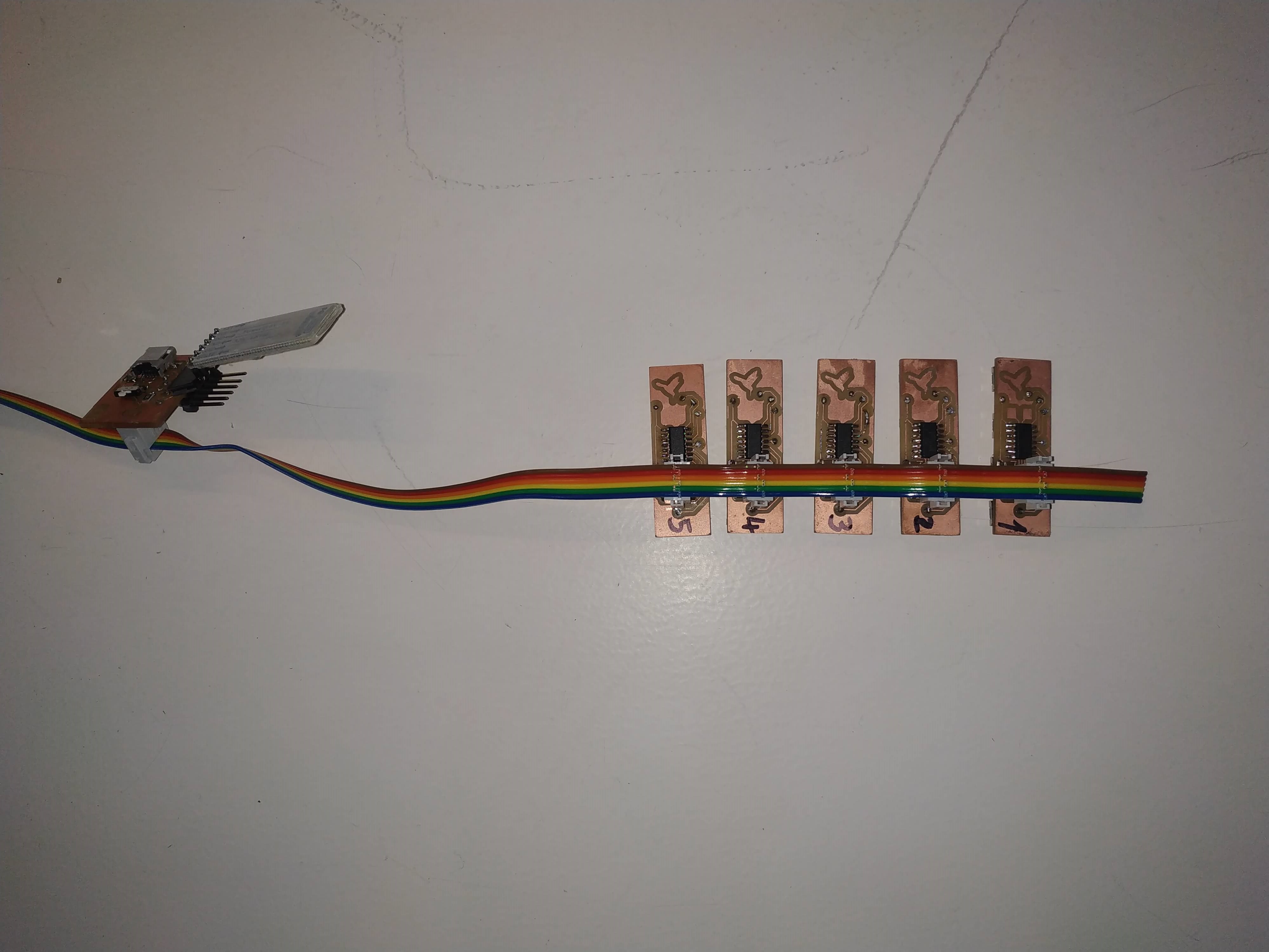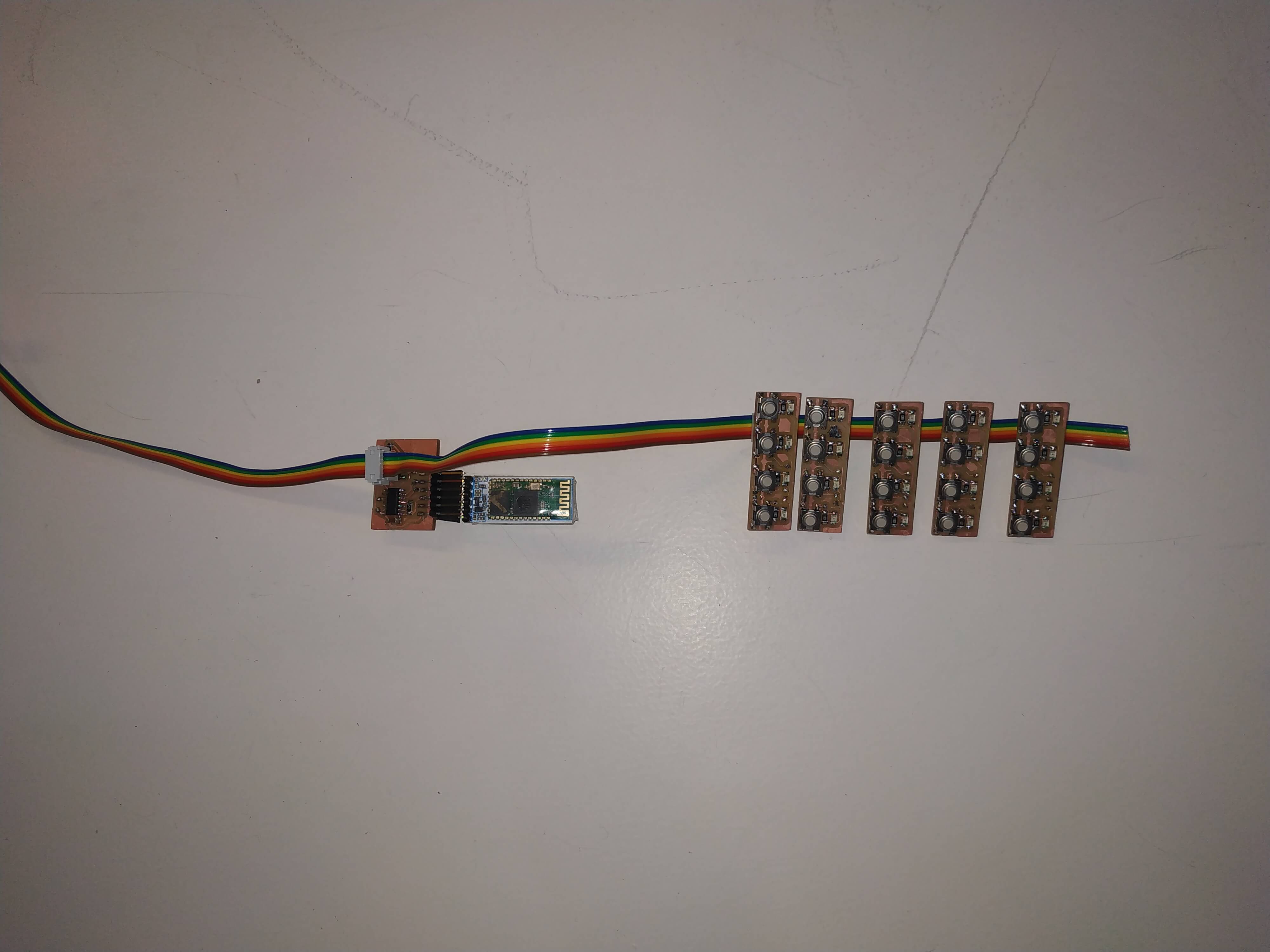 As I explained in the Networking Week this boards are equipped with 4 buttons and 4 LED's connected to 4 pins, allow them to act a s inputs or outputs to sense where someone is playing or to show where you have to play. This boards are two side boards and where done during that week, find the documentation on how to mill a 2 sided board in the Electronics Design week.