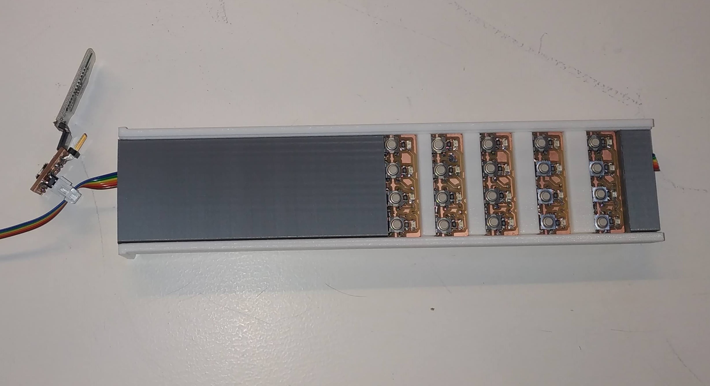 The model was designed to fit all the electronics inside the neck of the instrument, but I decided to keep the master board outside to let the connections out and to be able to change the components, connect an FTDI or the bluetooth module from outside. This was a fast solution, I will design en encasing for all the module in the future. This is how the electronics fit inside: