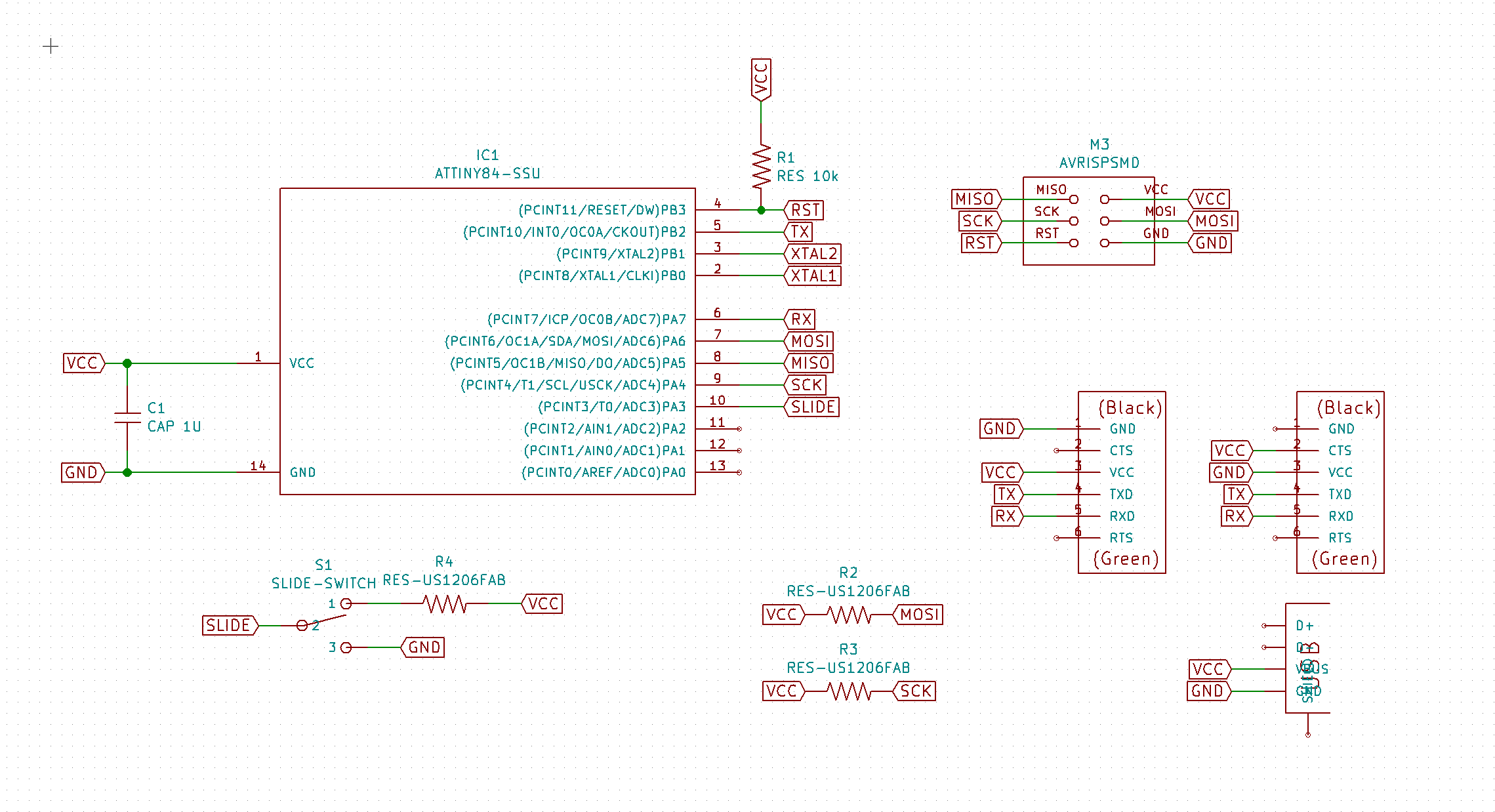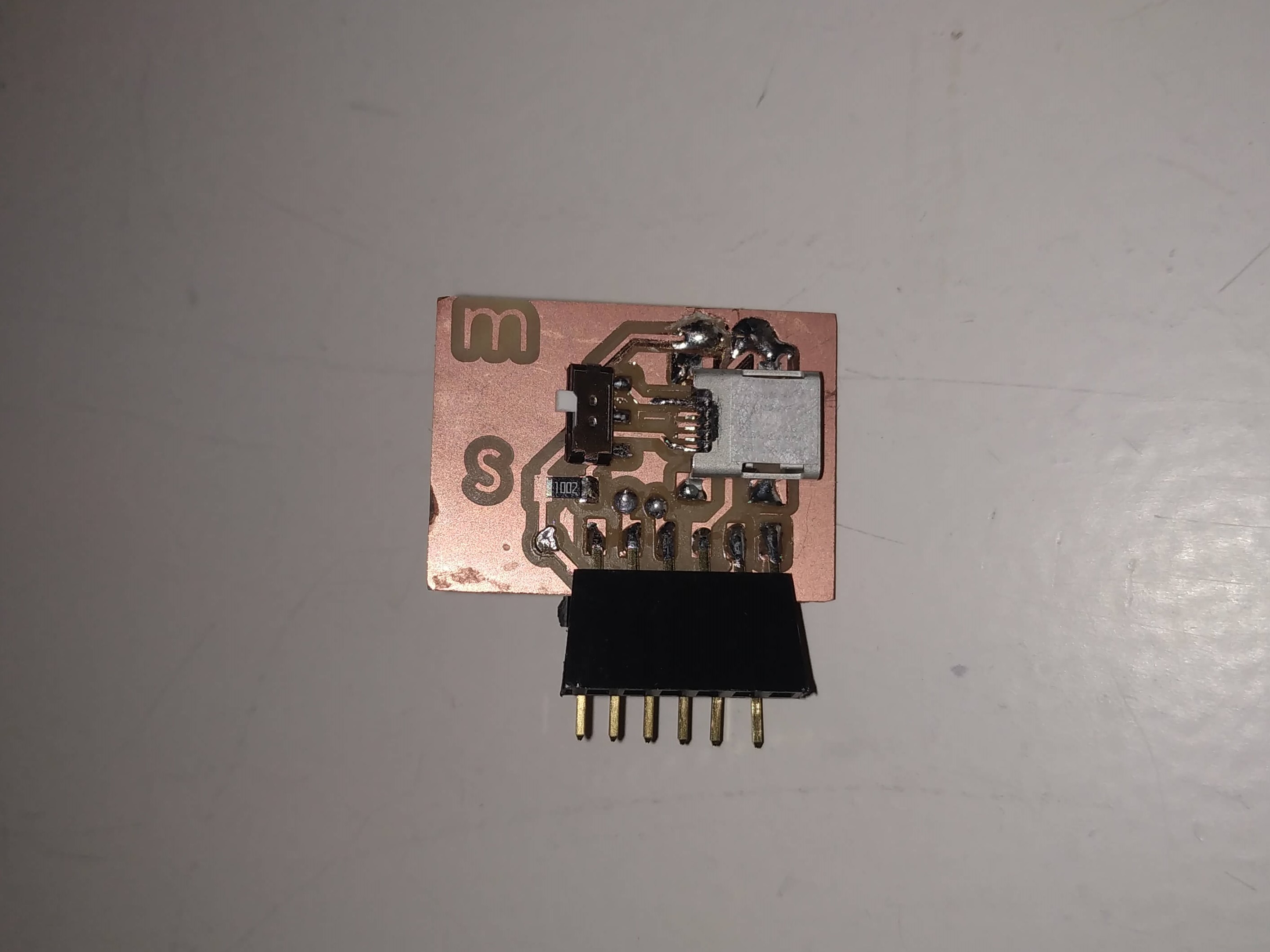 I decided to redesign this board from Networking Week, keeping the same components except for the clock, which I was not using, and adding the pull-up resistors and the pin connectors for the bluetooth module. This board was also a 2 sided board to keep it small and simple. I also added a slide button, but I wasn't able to program it because of the lack of time, but I will try to do it after to choose if the Ukulele is the master or the slave. To power the board I decided to add a Mini USB connection. Here it is the main design: